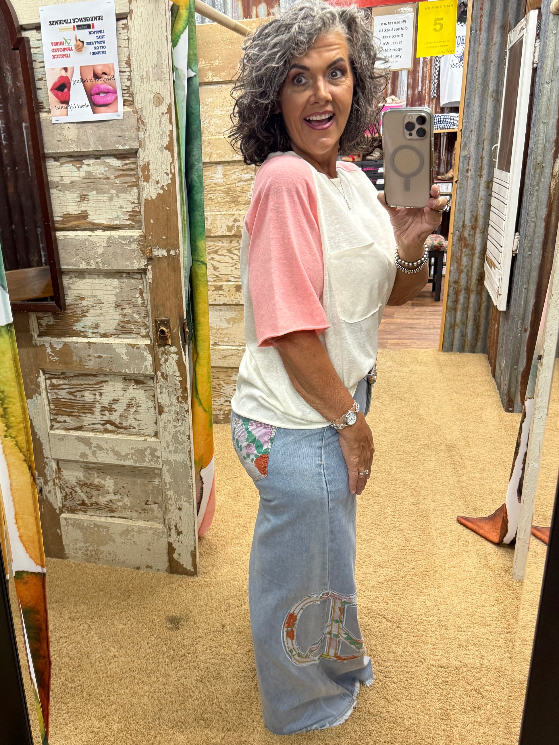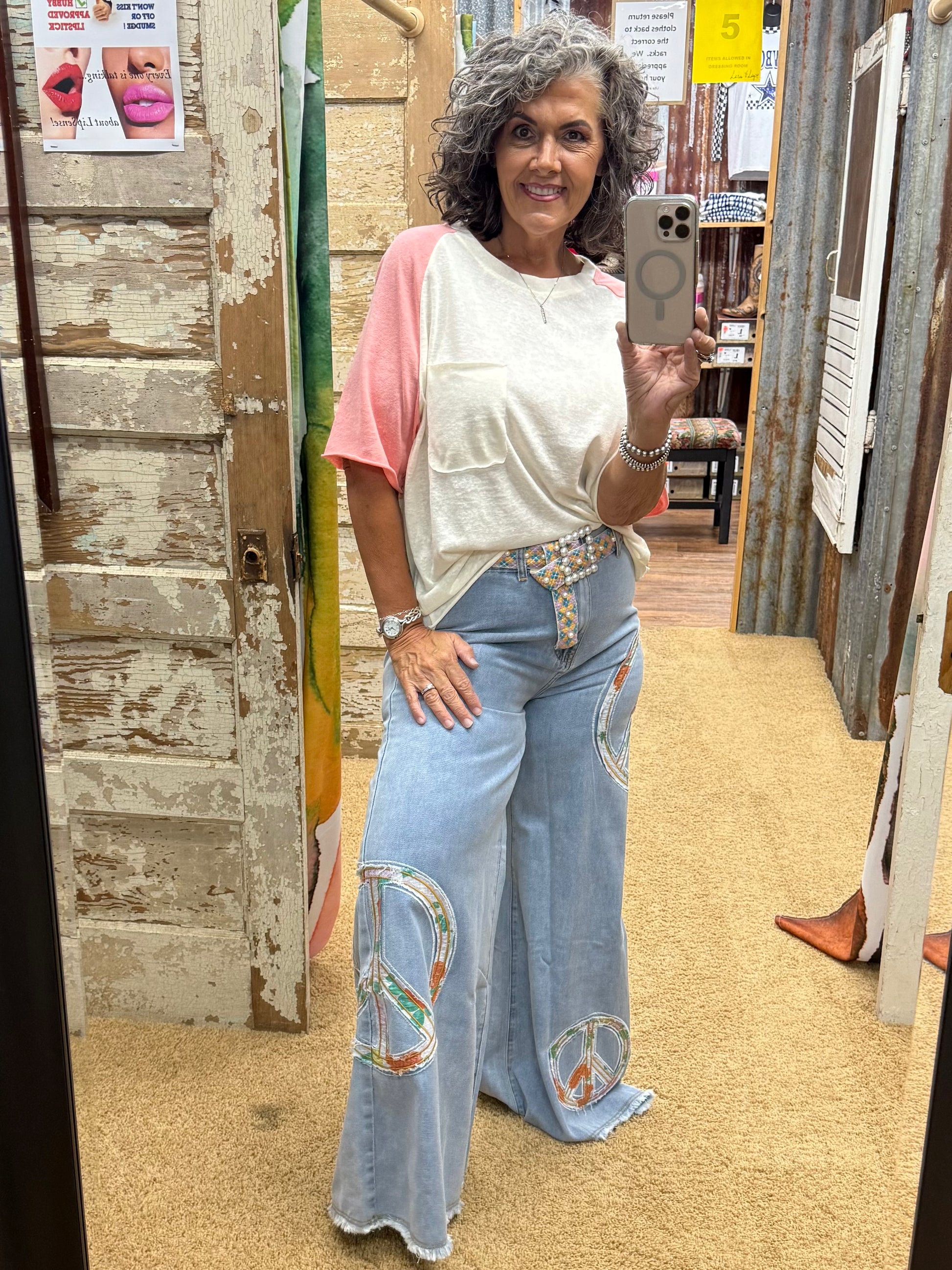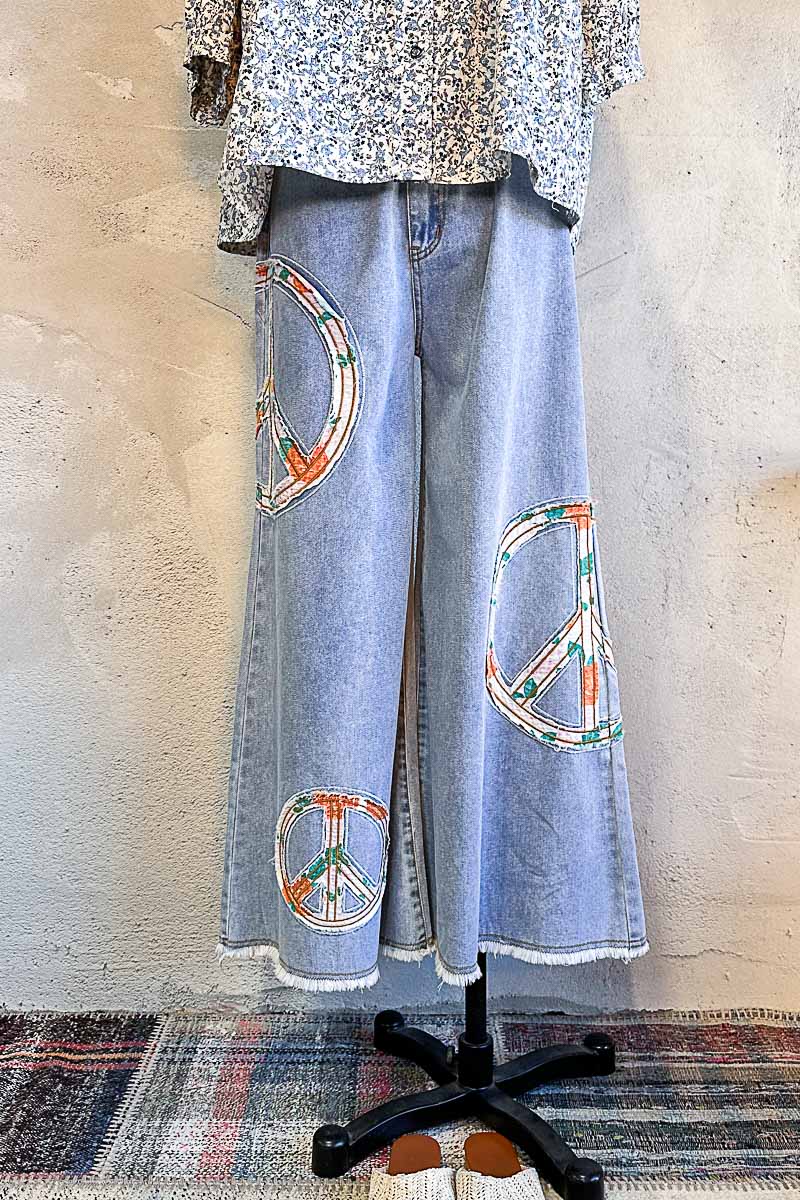 Designed in wide pants in denim with outseam double gauze and print peace patch, elastic band back waist, raw edge, vintage washing, solid color.
