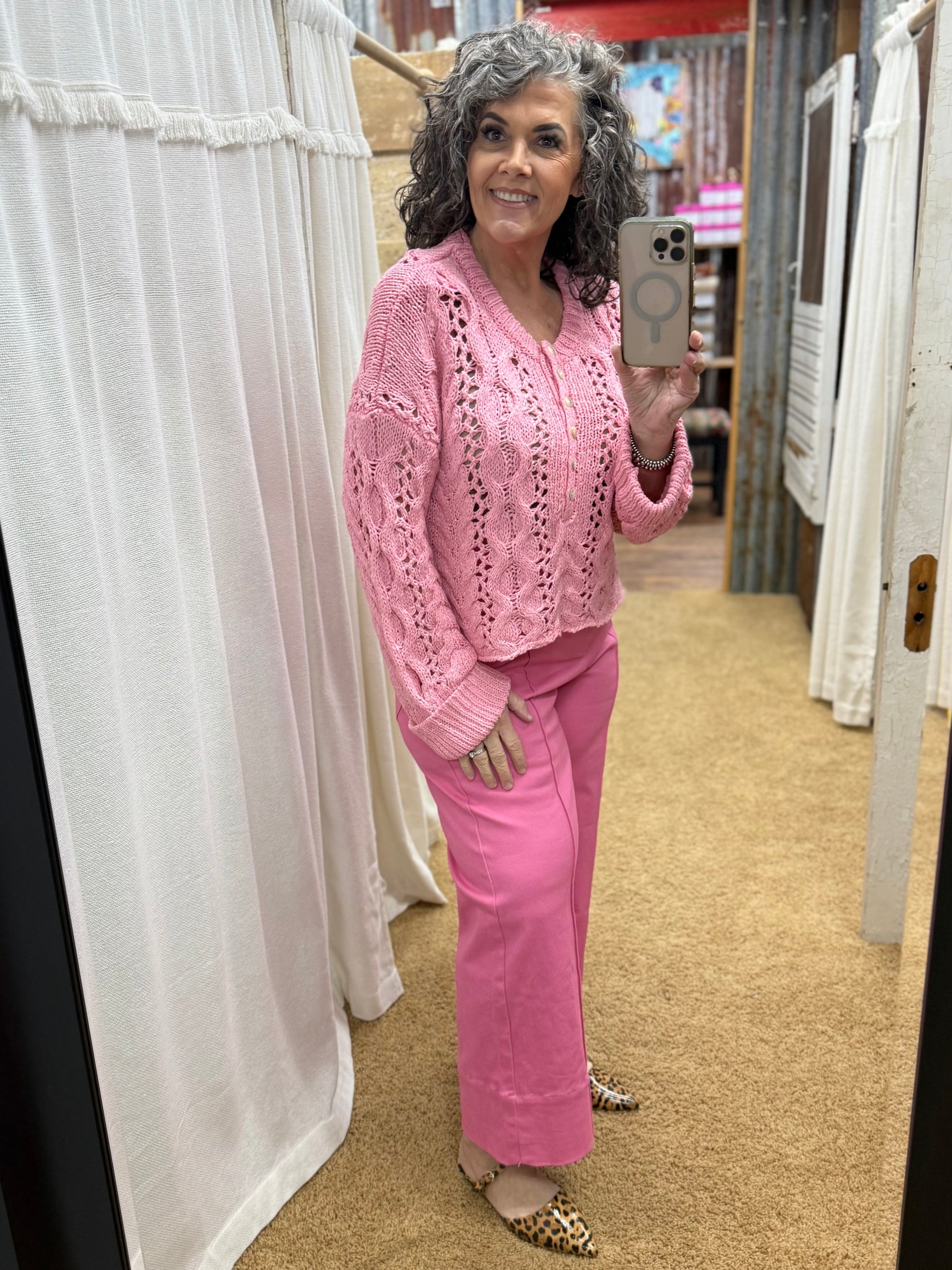 Effortless elegance meets everyday versatility with this open knit long sleeve top. The front button closure offers easy layering options, while the sheer, medium-weight knit creates a sophisticated silhouette that works beautifully over basics or as a standalone piece. Unlined construction keeps it lightweight and breathable, perfect for transitional seasons or layered styling. A wardrobe essential that balances comfort with timeless appeal.