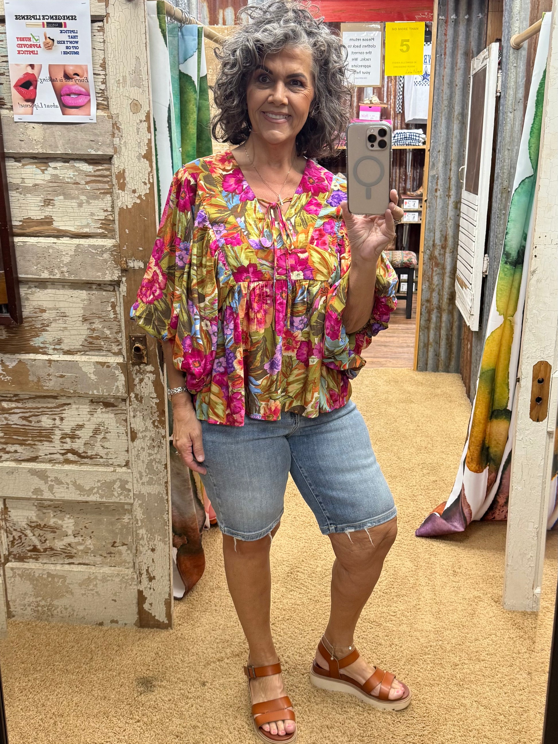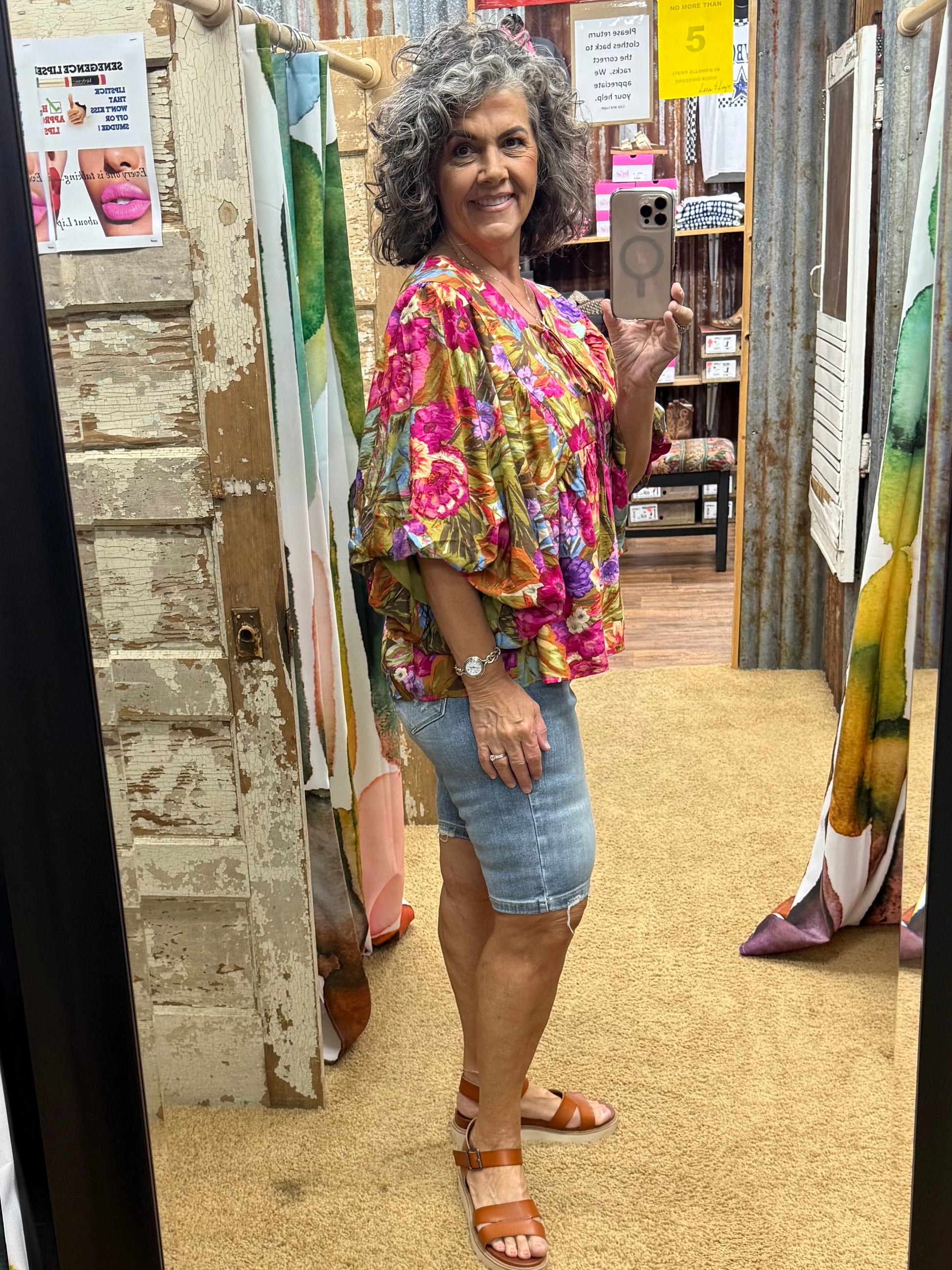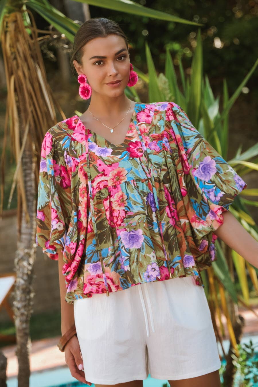 Lose yourself in the playful print and wide, bubbly sleeves of our Printed Blouse. With a plunging neckline and tie, this top is equal parts flirty and fun, perfect for any occasion. Make a statement with this quirky addition to your wardrobe.