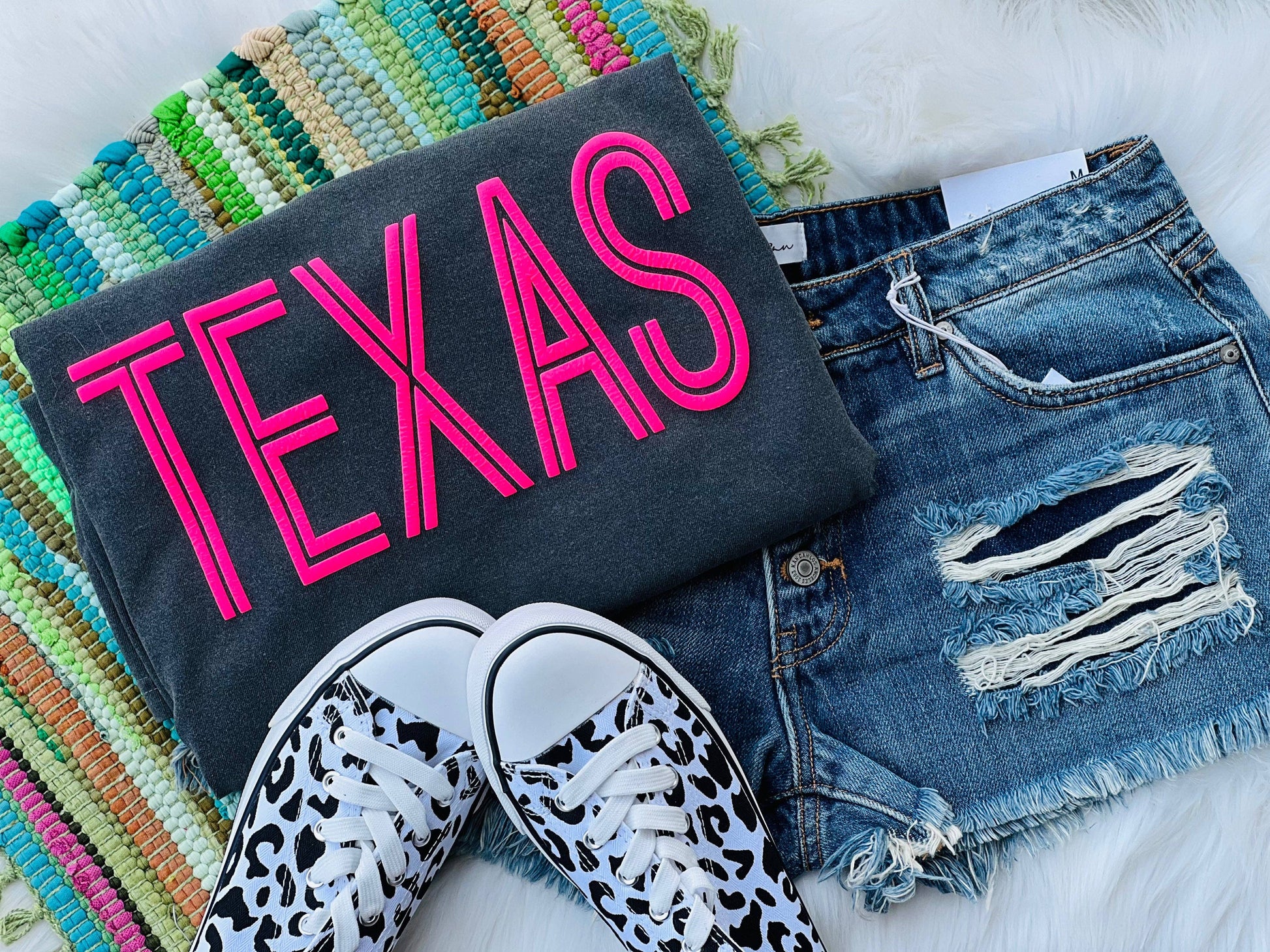 Add a pop of color to your wardrobe with our Pink Puff Paint Texas Tee Comfort! Featuring a neon pink design and short sleeves for ultimate comfort. Stand out from the crowd in style and make a statement. (Yeehaw!)
