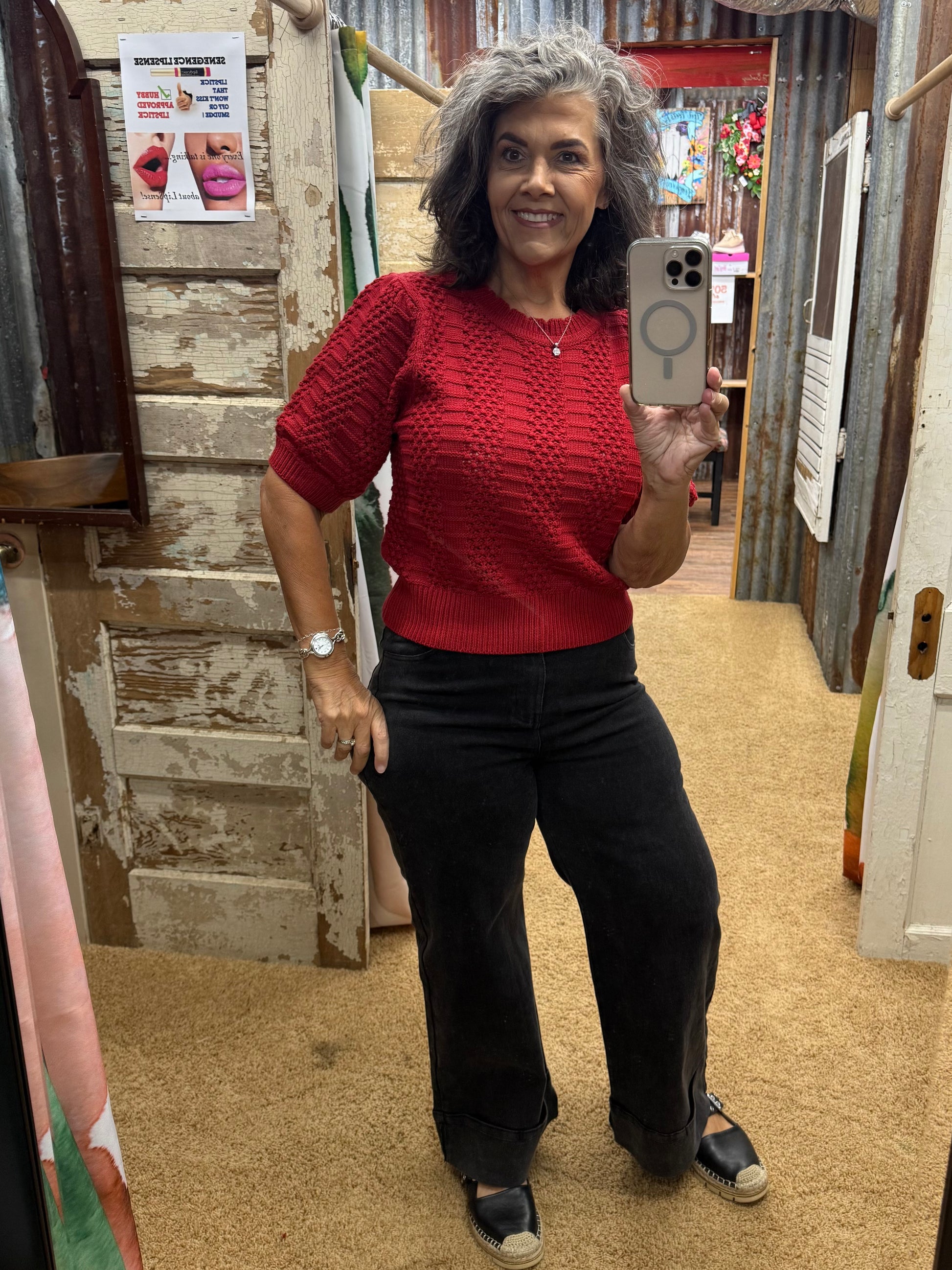 Solid multi-pattern short sleeve sweater knit pullover top. Unlined. Knit. Non-sheer. Lightweight.