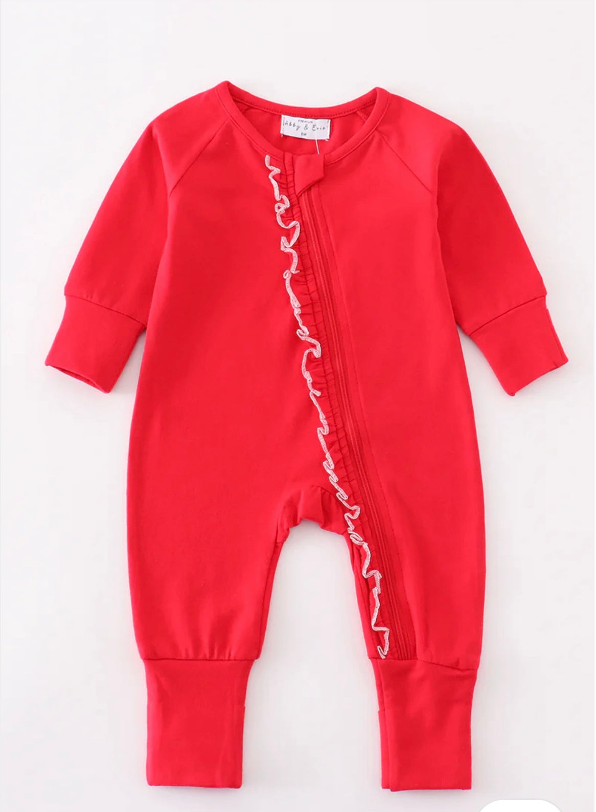 This cozy Red Zipper Ruffle Girl Sleeper is perfect for your little one's winter wardrobe! With a festive red color and cute ruffle detail, it's perfect for Christmas pajama parties. Made for baby girls, this sleeper will keep them warm and stylish all season long.