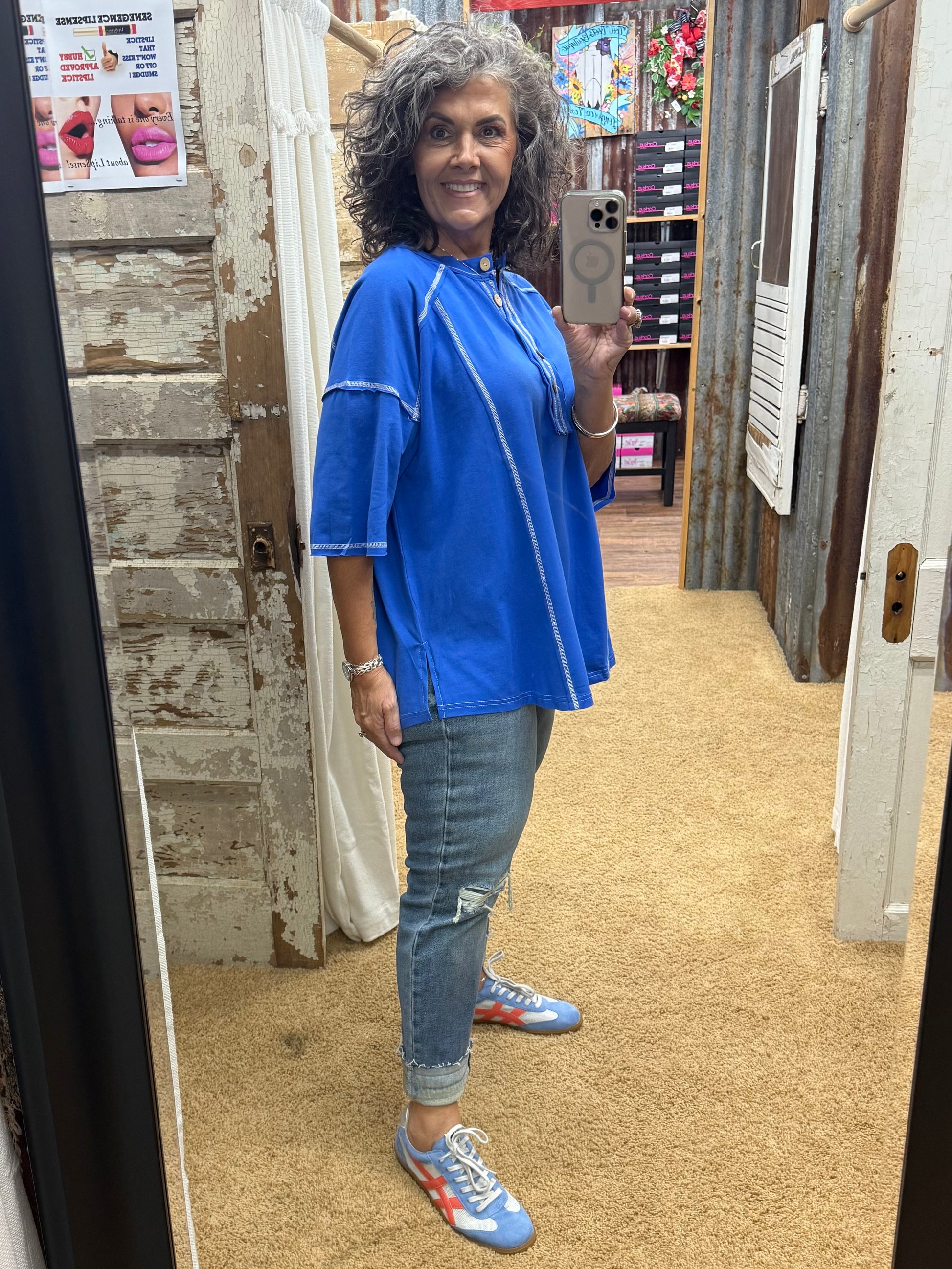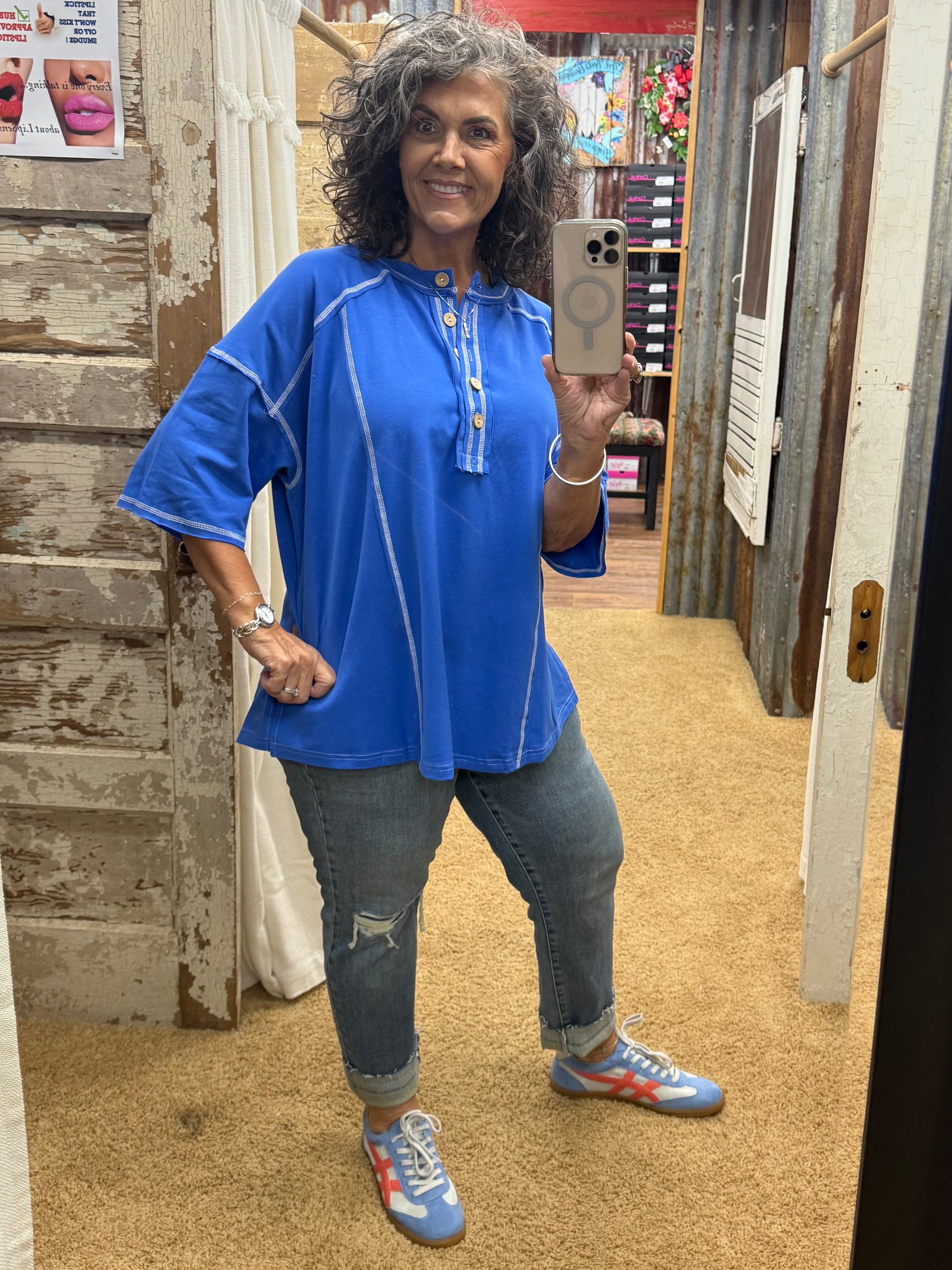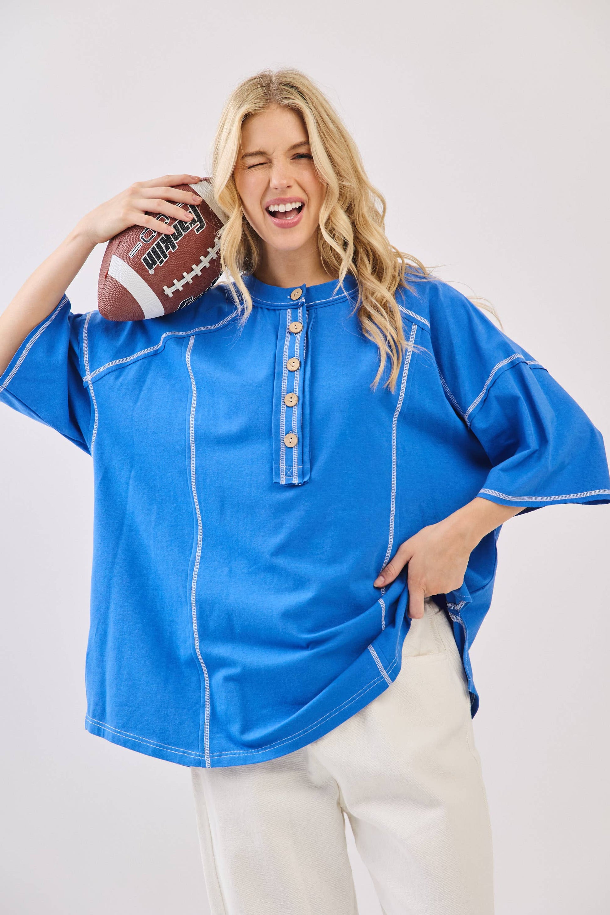 Cheer on your team in effortless style with this relaxed-fit henley tee. Crafted from soft cotton with exposed seam details, this top features a split neckline with a four-button placket for a laid-back yet polished look. The wide short sleeves and roomy silhouette offer all-day comfort, making it the perfect pick for gameday gatherings, casual weekends, or layering under your favorite outerwear. game day henley, oversized henley tee, button front top, relaxed fit shirt, casual gameday look, women's football outfit, cotton henley tee, varsity game day style, comfy team color top, boutique casual top, exposed seam tee, short sleeve henley, fall fashion, western henley, laid-back fanwear