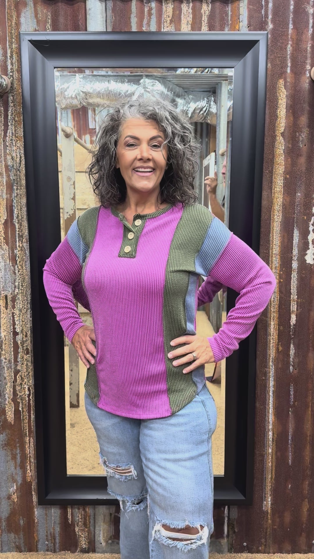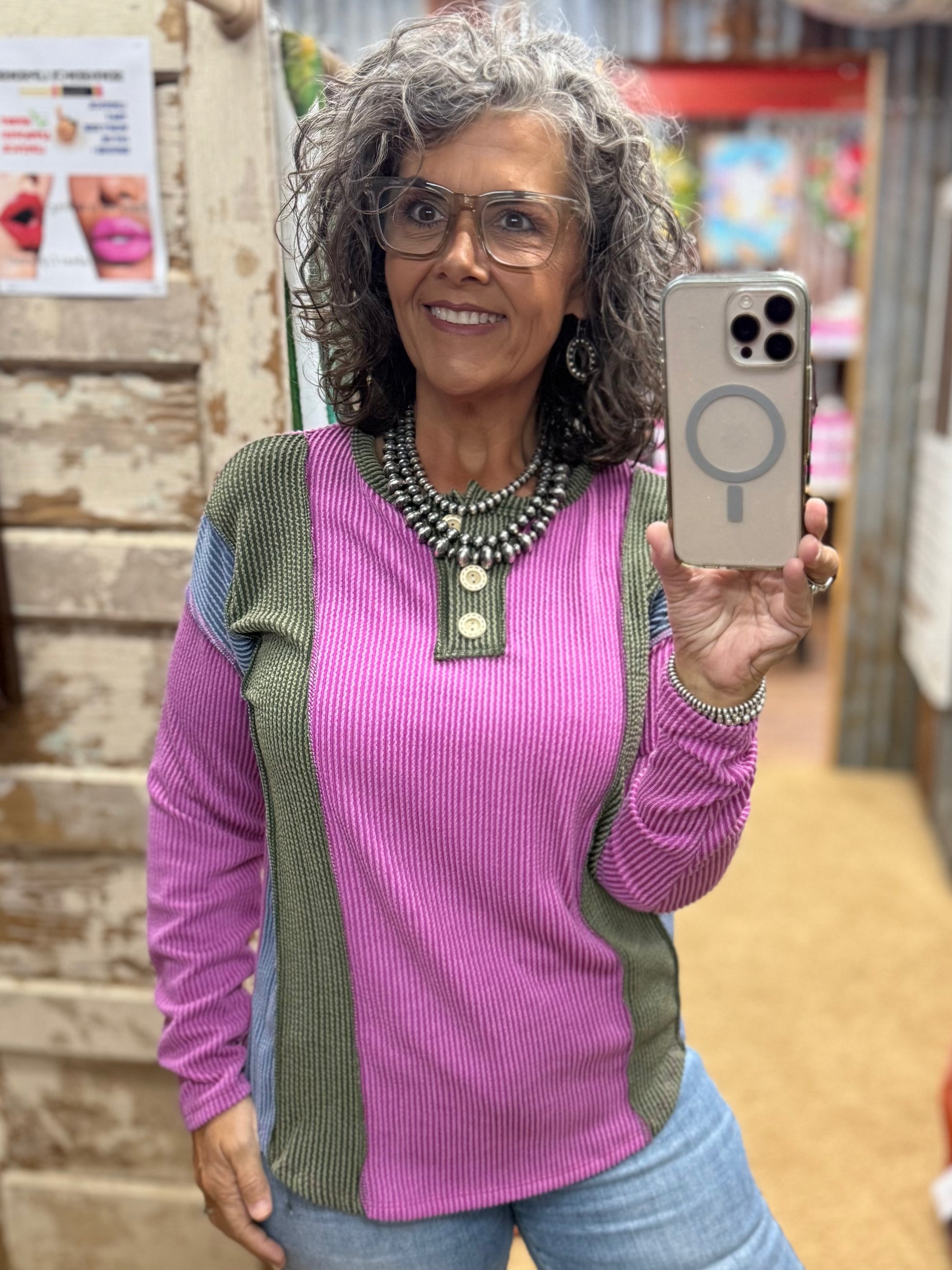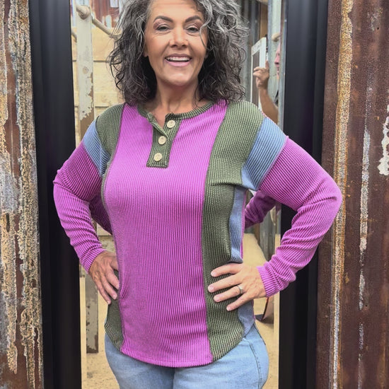 Add a pop of color to your wardrobe with this magenta ribbed top! Featuring a playful color block detail, a comfy round neck, and button-front accents, it’s perfect for layering or wearing solo. The exposed stitching and relaxed fit keep things casual and fun, while long sleeves make it ideal for cooler days.