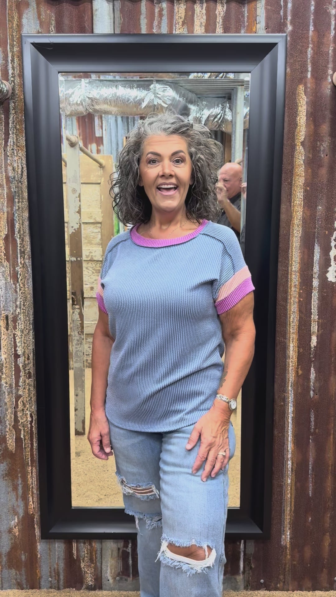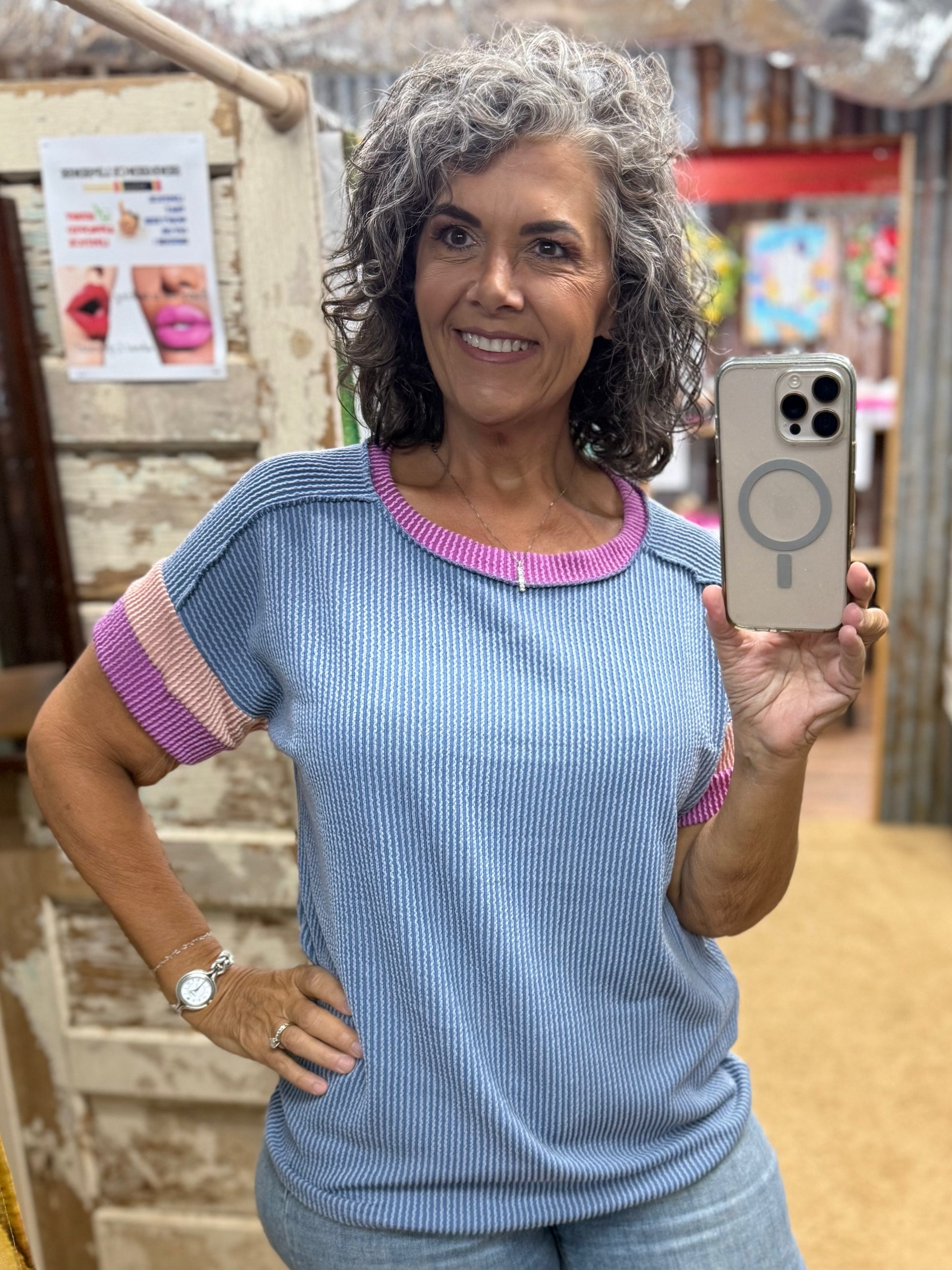 A RIBBED TOP FEATURING A ROUND NECK, COLOR BLOCK CONTRAST, EXPOSED STITCH, DROP SHOULDER, AND A CASUAL RELAXED FIT.