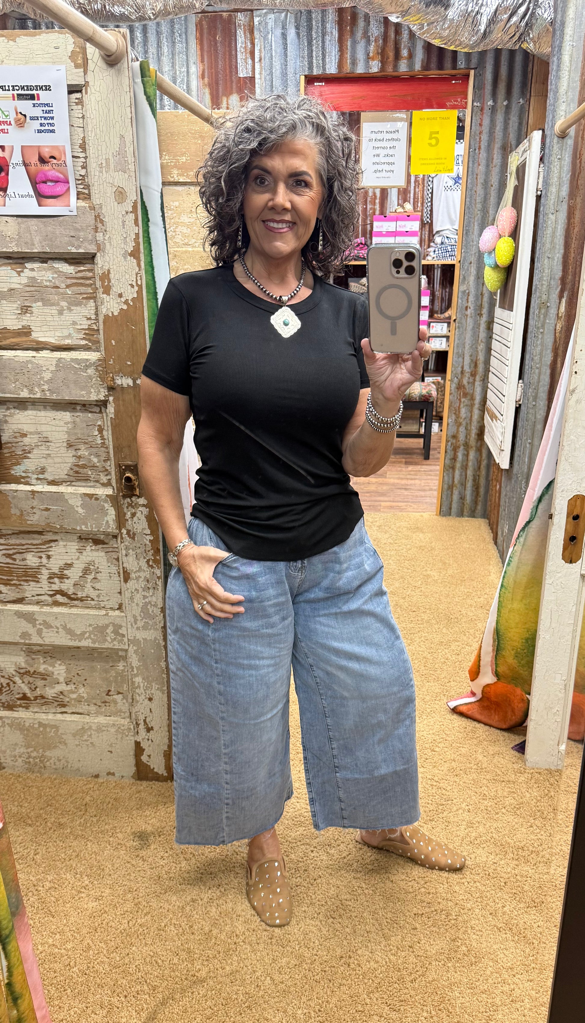 Take a break from basic tees and spice up your wardrobe with our Black Ribbed Curved Hem Round-Neck Tee. Made from a soft and stretchy blend of rayon and spandex, this tee features a unique ribbed curved hem and a playful round-neck design. Add some personality to your style with this quirky and comfortable tee.