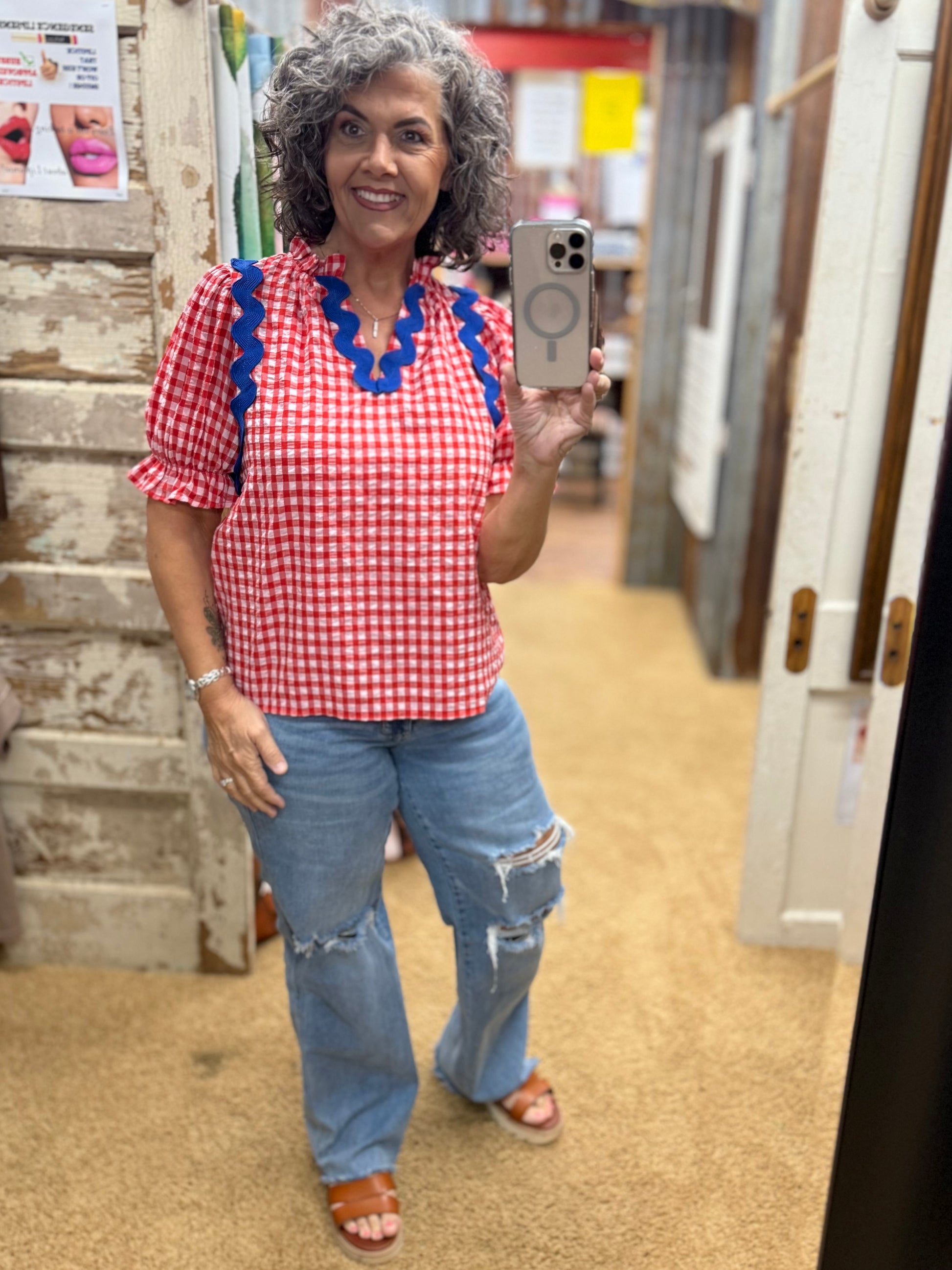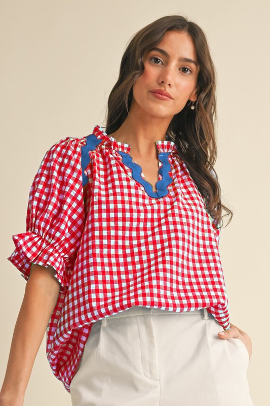 Ric-rac Trimmed RED Gingham Check Puff Sleeve Blouse