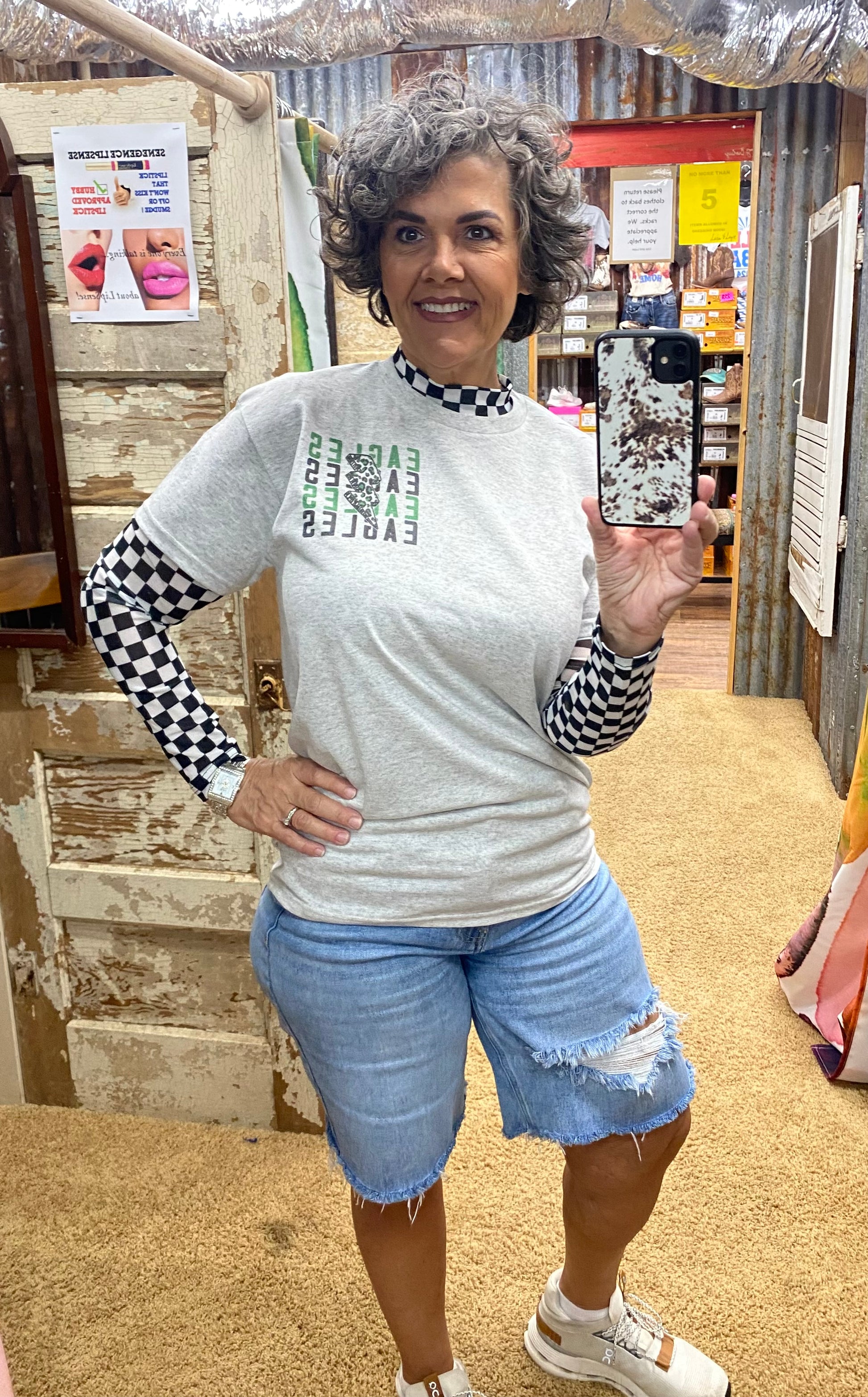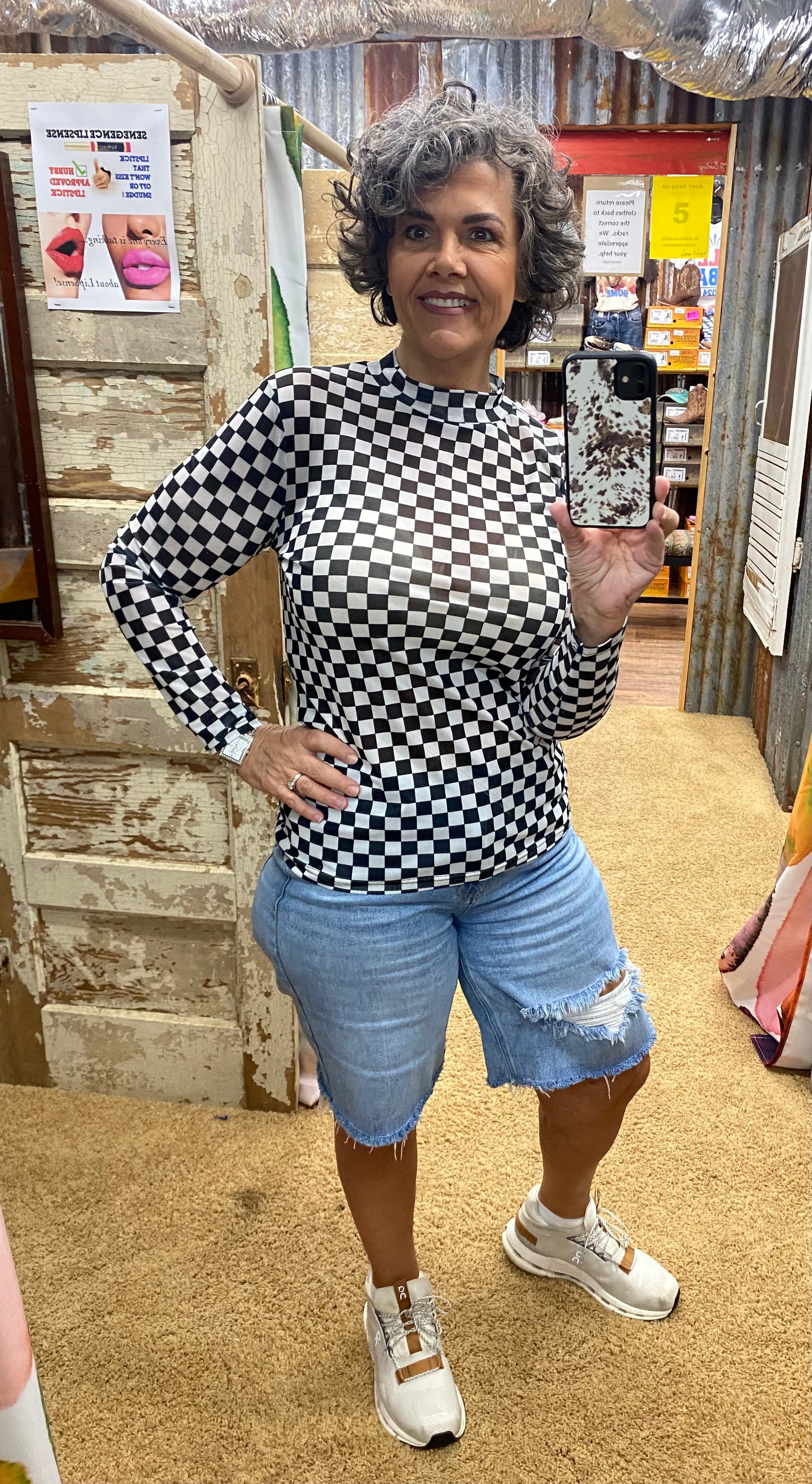 Get on track to looking trendy with this Round The Track Top! In classic black and white checkered style, the long sleeve mesh provides a unique look and feel, perfect for adding a statement to any outfit. P.S. It's a checkered flag to the fashion finish line!