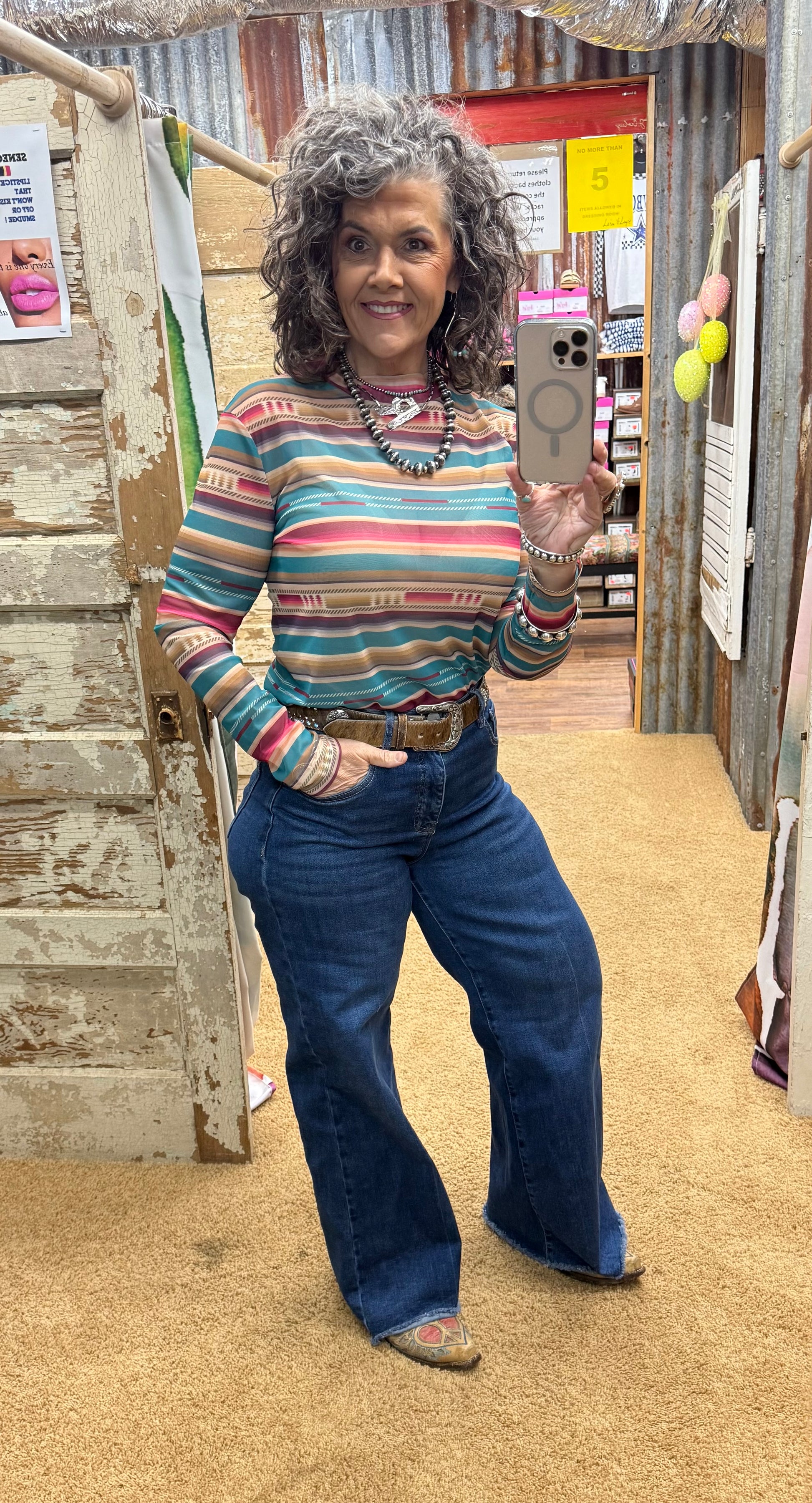 Run away from boring fashion with our Running Away Top! This long sleeve mesh top features a mesmerizing serape print, making it the perfect choice for those who want to add a pop of color and personality to their wardrobe. Embrace your fashion sense and stand out from the crowd with this unique top.