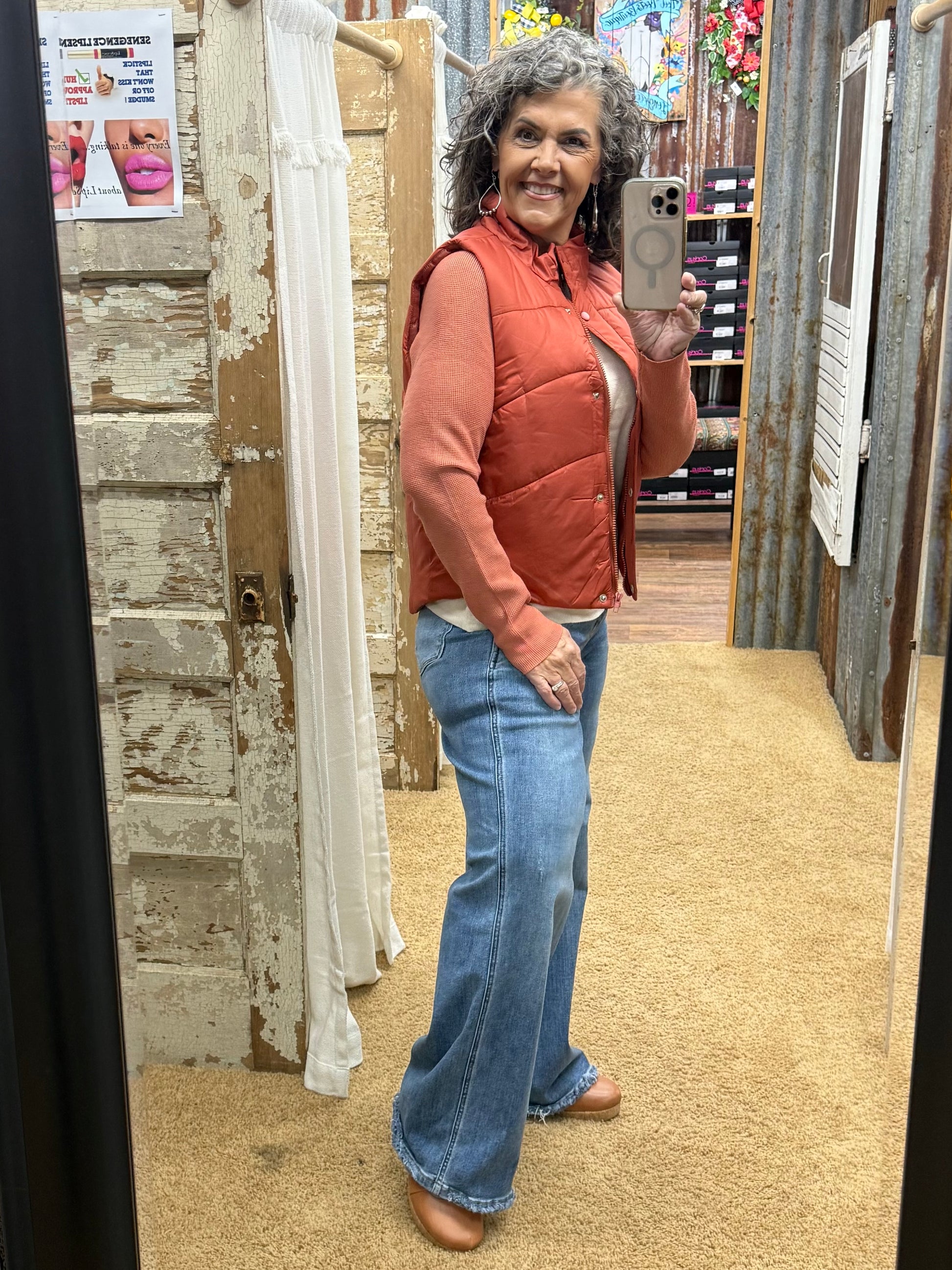 Stay cozy and stylish with this rust puffer vest featuring a polar collar and a hidden snap zip-up front. Designed with convenient side pockets, it’s perfect for keeping your hands warm or stashing essentials. Lightweight yet warm, this vest adds playful flair to any outfit while keeping you snug on chilly days.