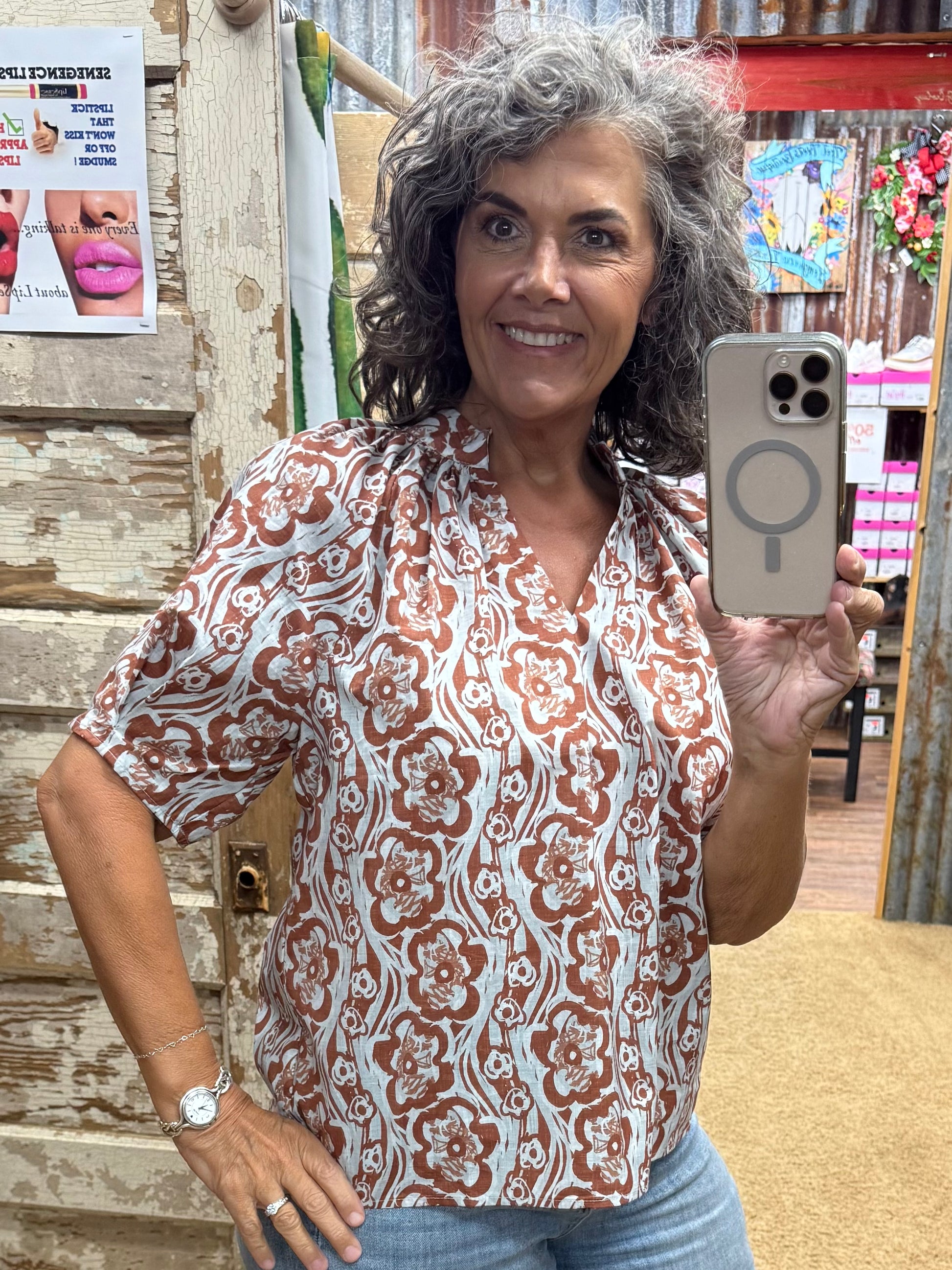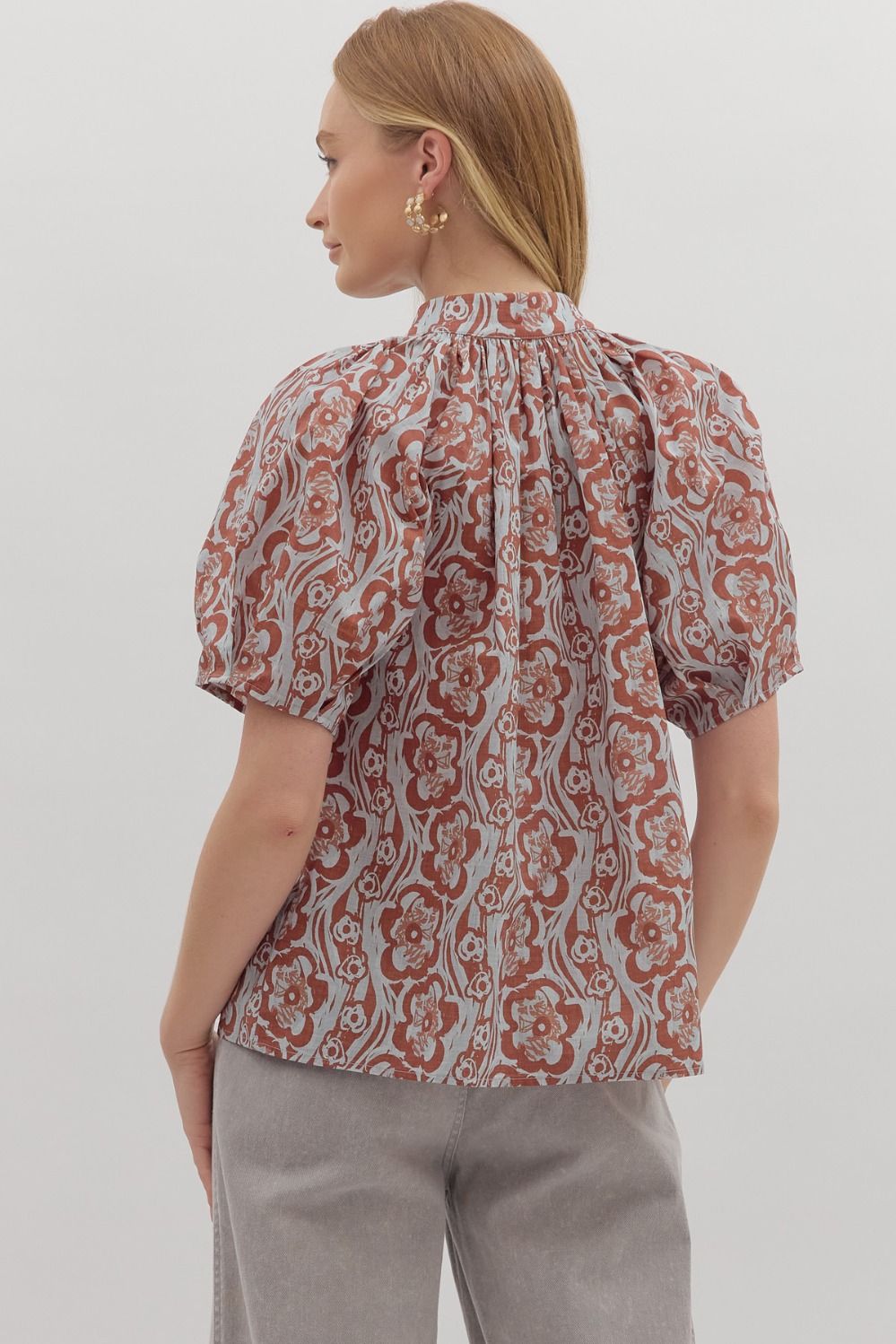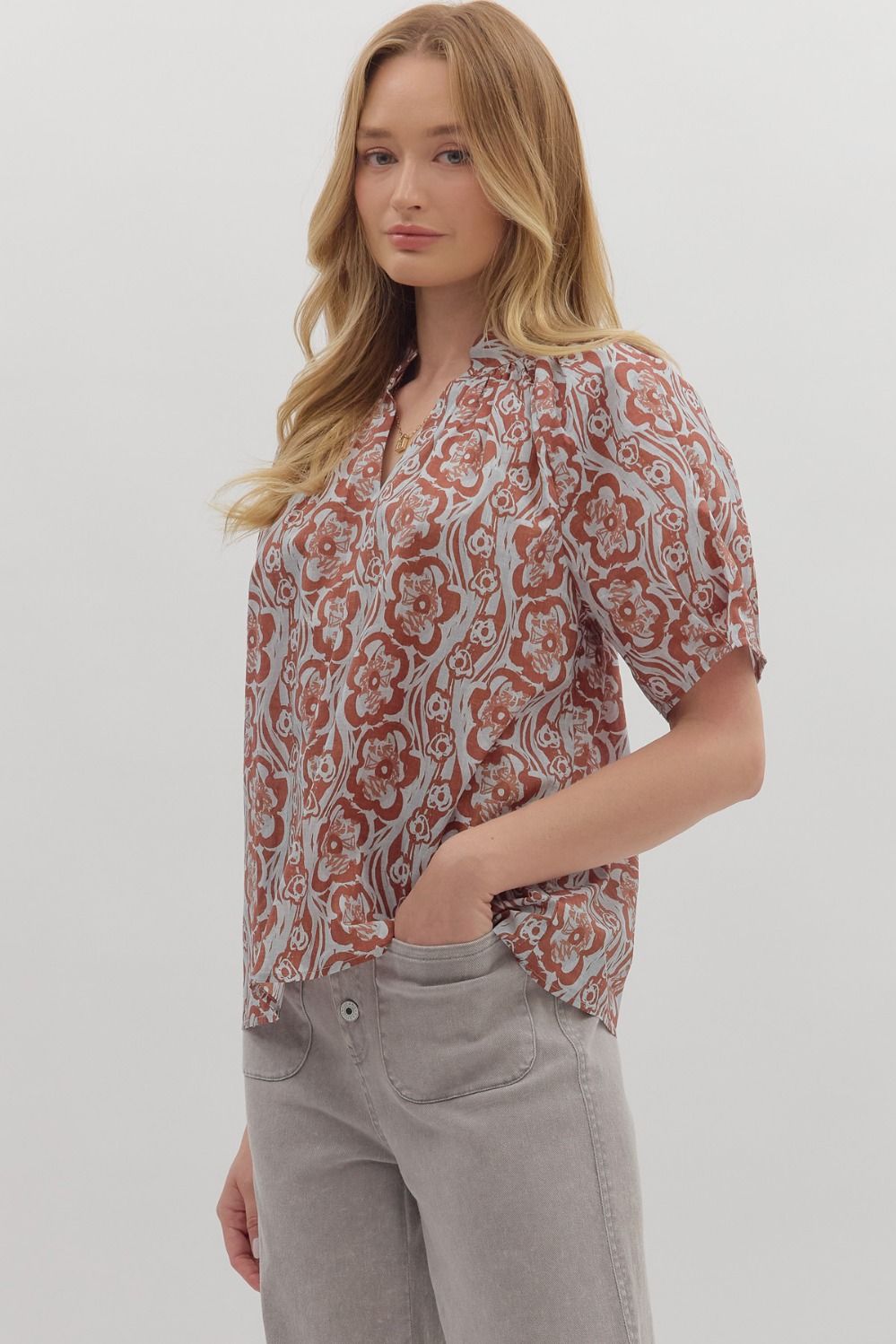 Elevate your wardrobe with the Short Sleeve Camel Blouse by Entro, featuring a delicate floral print and pleated raglan short puff sleeves. The ruffled accent neck band and V-neckline add a refined touch, while the lightweight woven fabric ensures comfort without sheerness. Unlined for a breathable fit, this blouse effortlessly blends elegance with everyday wearability.
