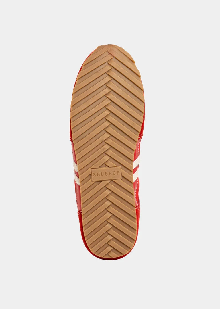 Upper: Faux suede and synthetic leather in bright red with cream stripe accents