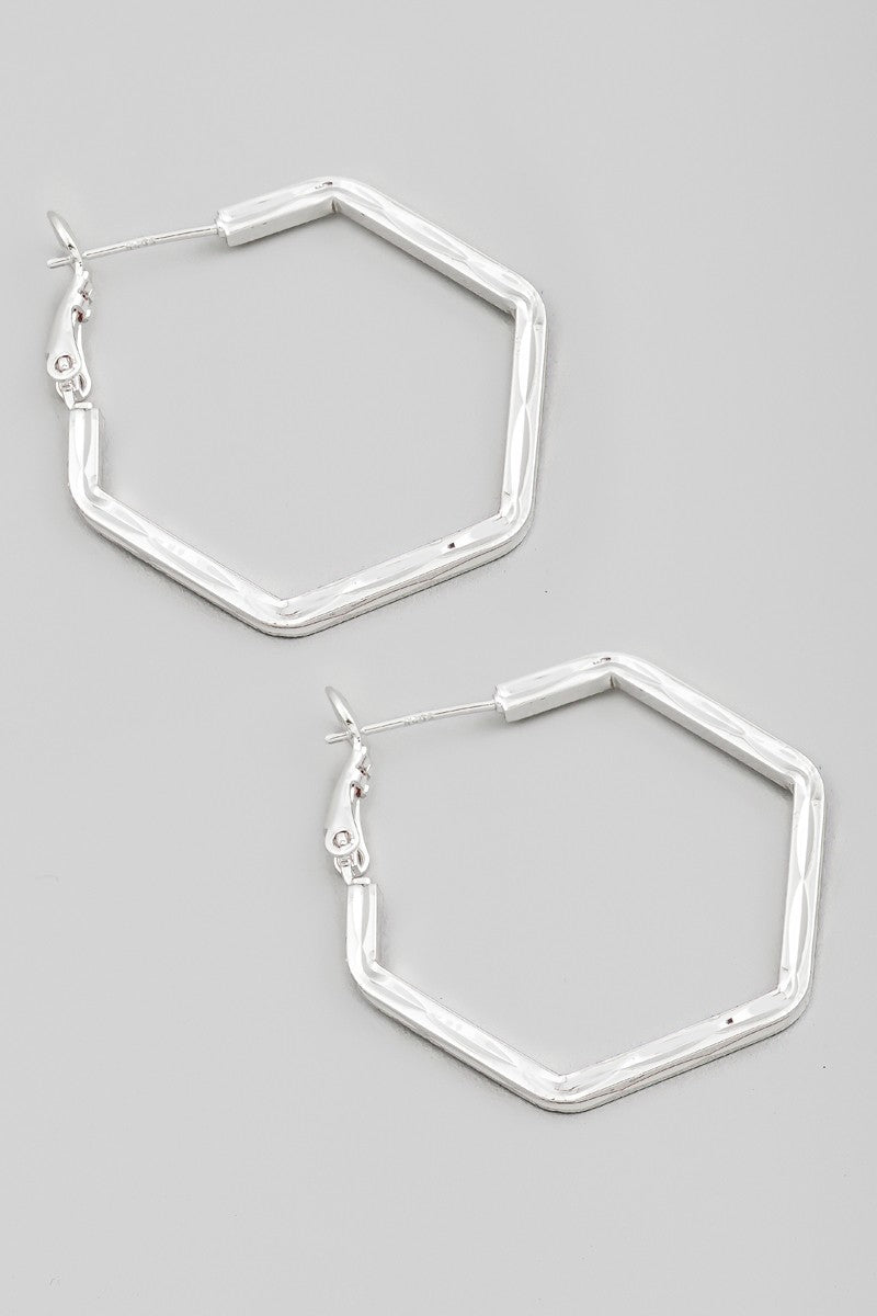 Silver Textured Flat Metallic Hexagon Hoop Earrings
