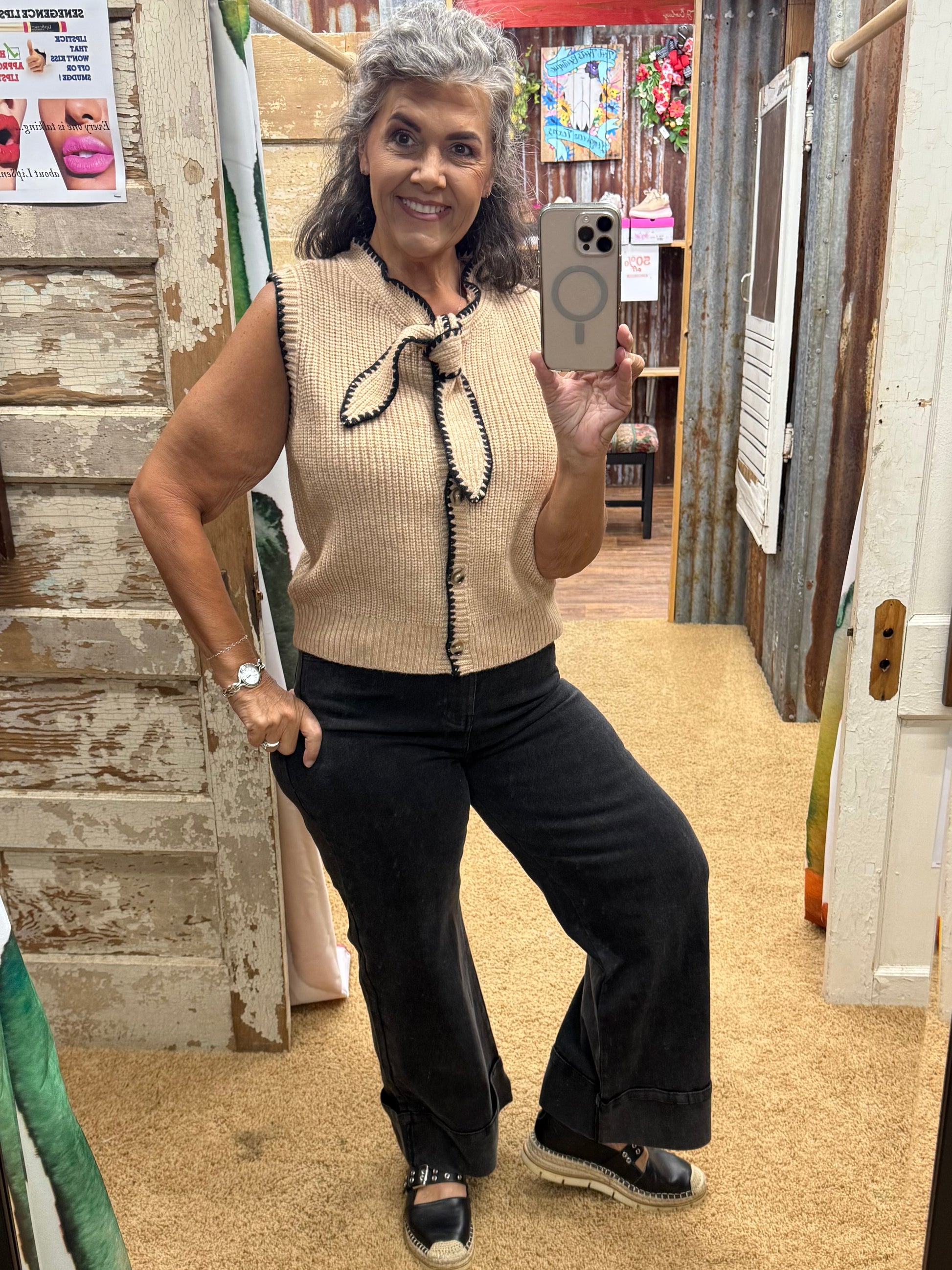 Solid sleeveless sweater knit button front knot closure top featuring accent blanket stitch finish details. Unlined. Knit. Non-sheer. Lightweight. 42%ACRYLIC 30%POLYESTER 28%NYLON