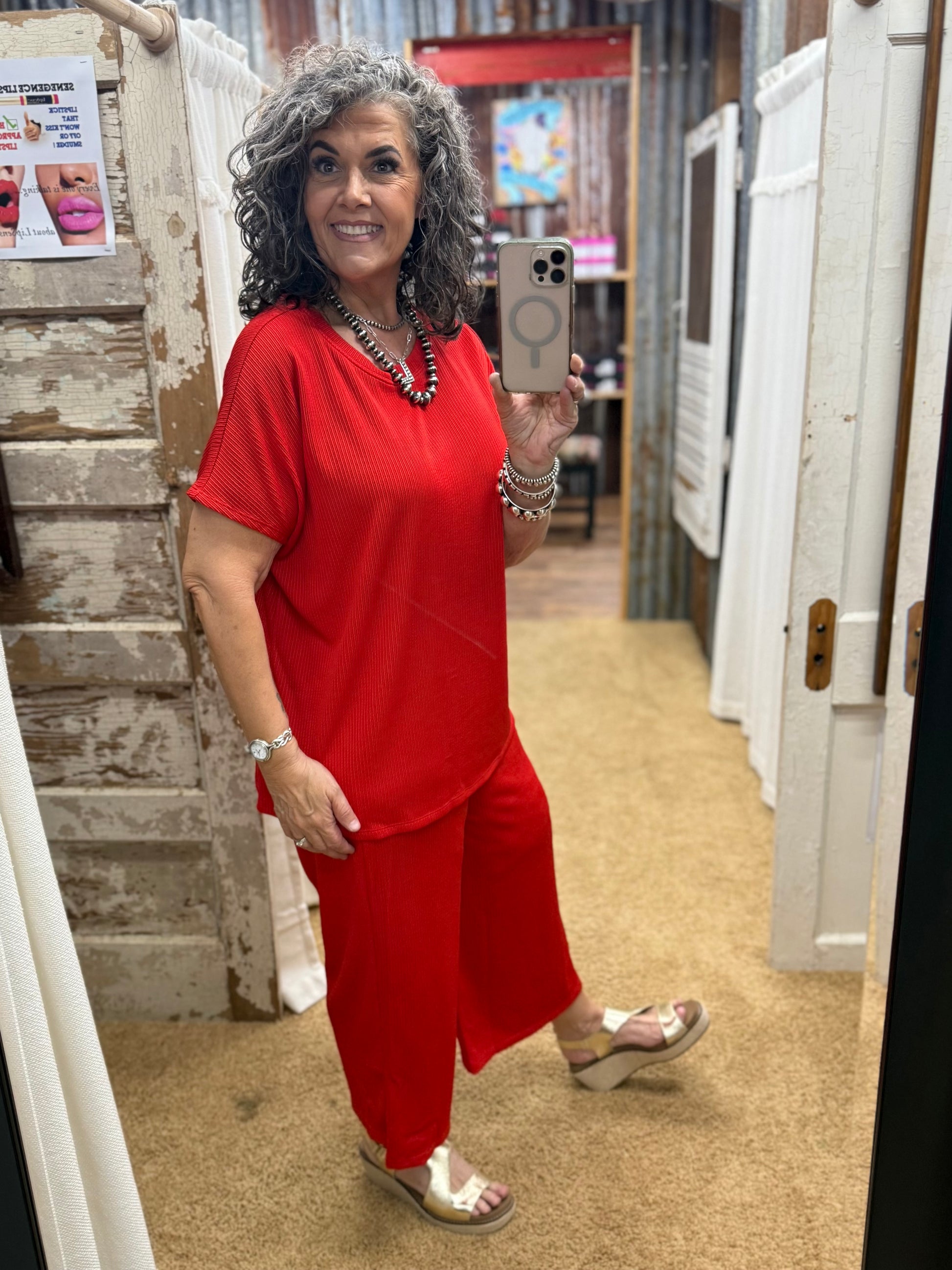 Relaxed, easygoing, and flattering fit! We love the elastic waistline on the pants!