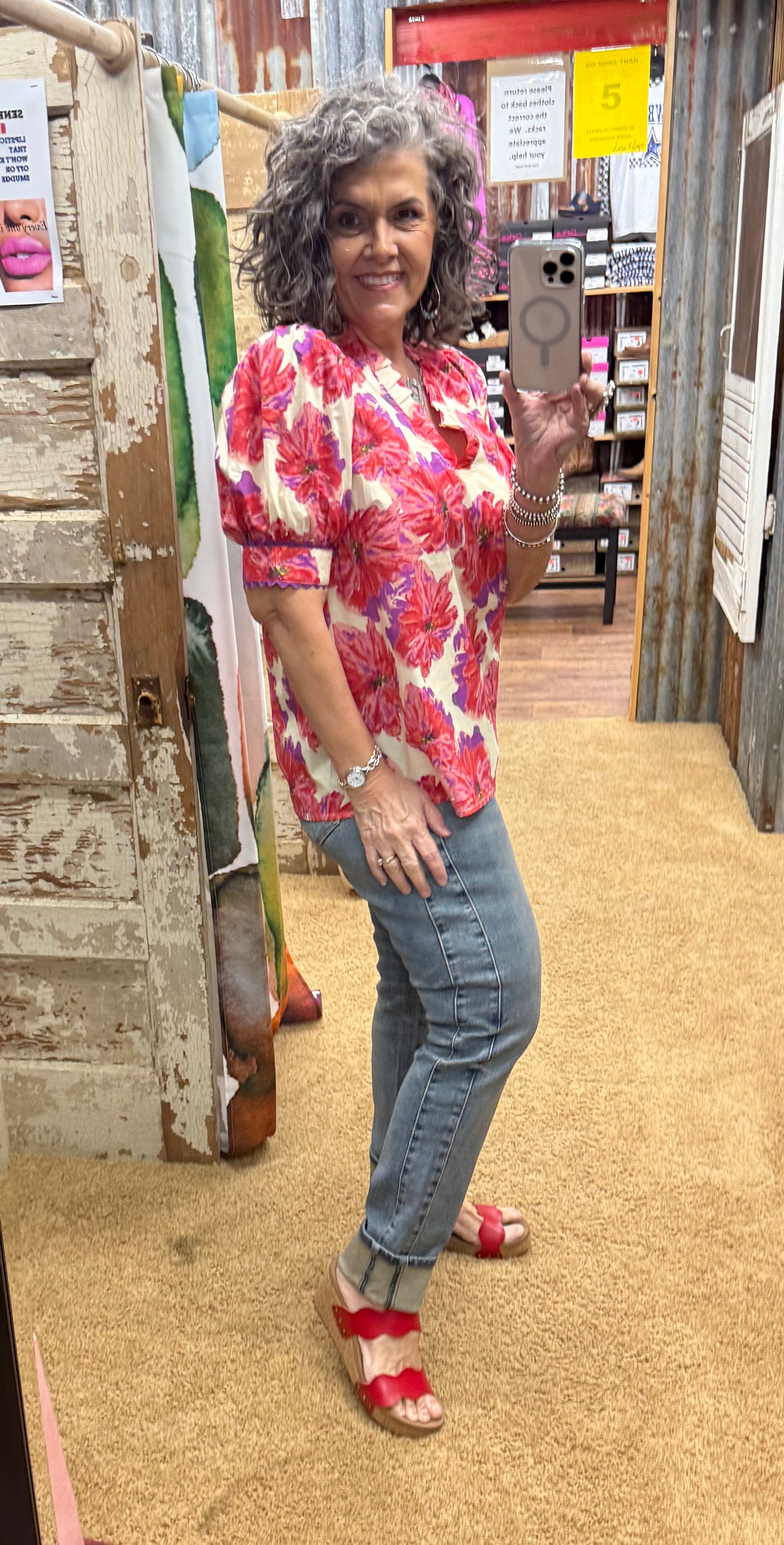 Add some floral flair to your wardrobe with our Soul Sister Blouse! This playful pullover top features a vibrant floral print, short puff sleeves with a cute ric rac trim, and a flattering ruffle accented v-neck. Perfect for bringing some fun and whimsy to your everyday look.