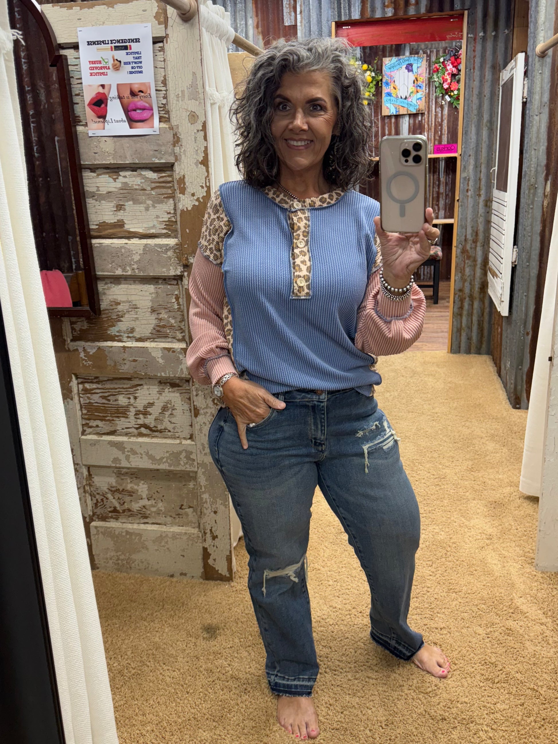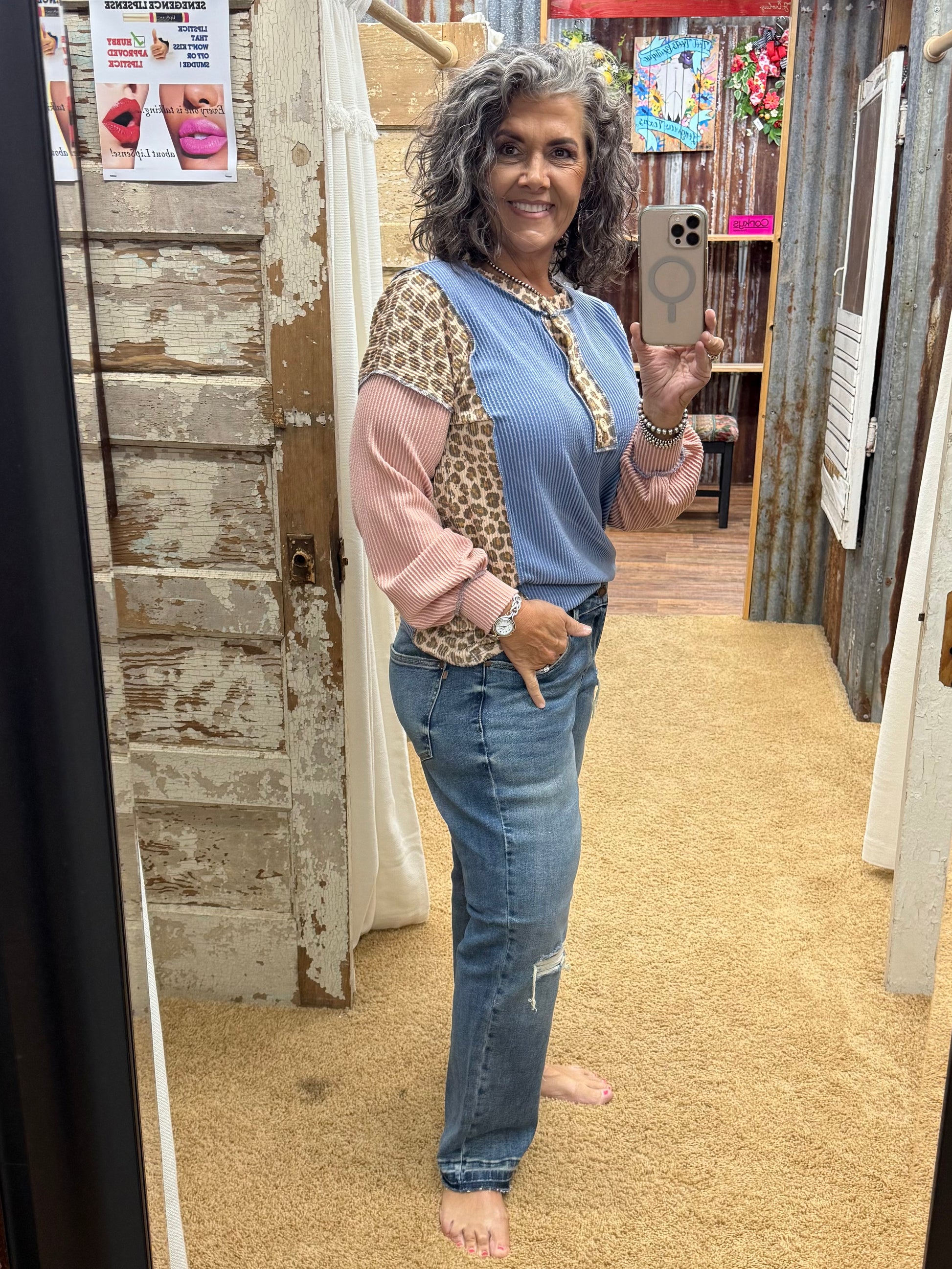 Add a playful twist to your wardrobe with the Stand By Me Animal Print Solid Rib Top. Crafted from soft ribbed fabric, it combines bold animal print with chic solid color blocks for a trendy look. The round neckline and banded cuffs add subtle style, while the functional button-down front lets you customize your vibe. Perfect for mixing and matching, this top brings contemporary flair to any outfit.
