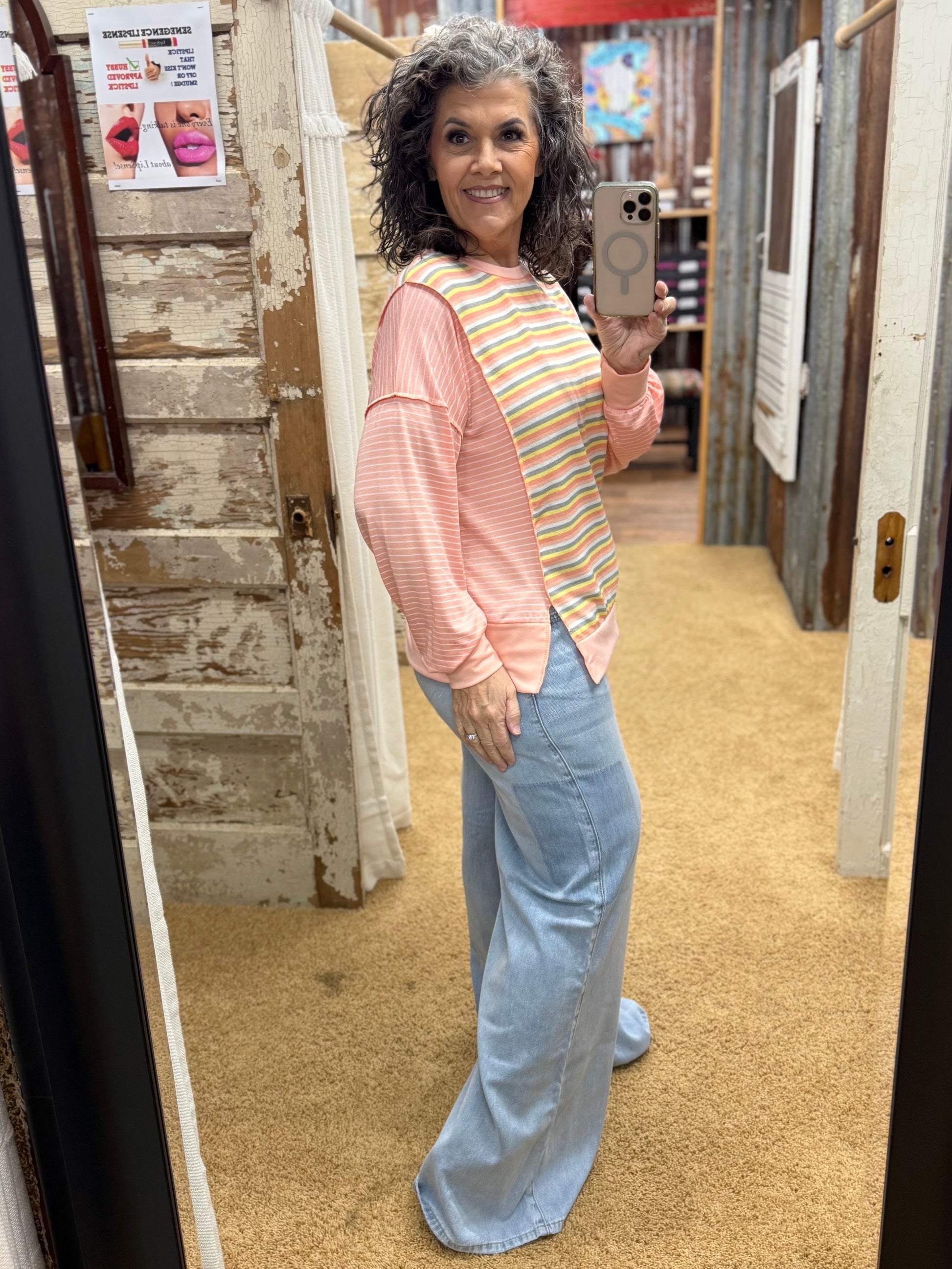 Elevate your everyday style with this charming peach striped long sleeve pullover. The soft knit fabric drapes beautifully while the classic horizontal stripes add visual interest and versatility to your wardrobe. Perfect for layering or wearing solo, this pullover transitions seamlessly from casual weekends to relaxed workdays. The comfortable fit and timeless design make it an essential piece you'll reach for again and again. Pair it with your favorite denim or joggers for an effortlessly put-together look.