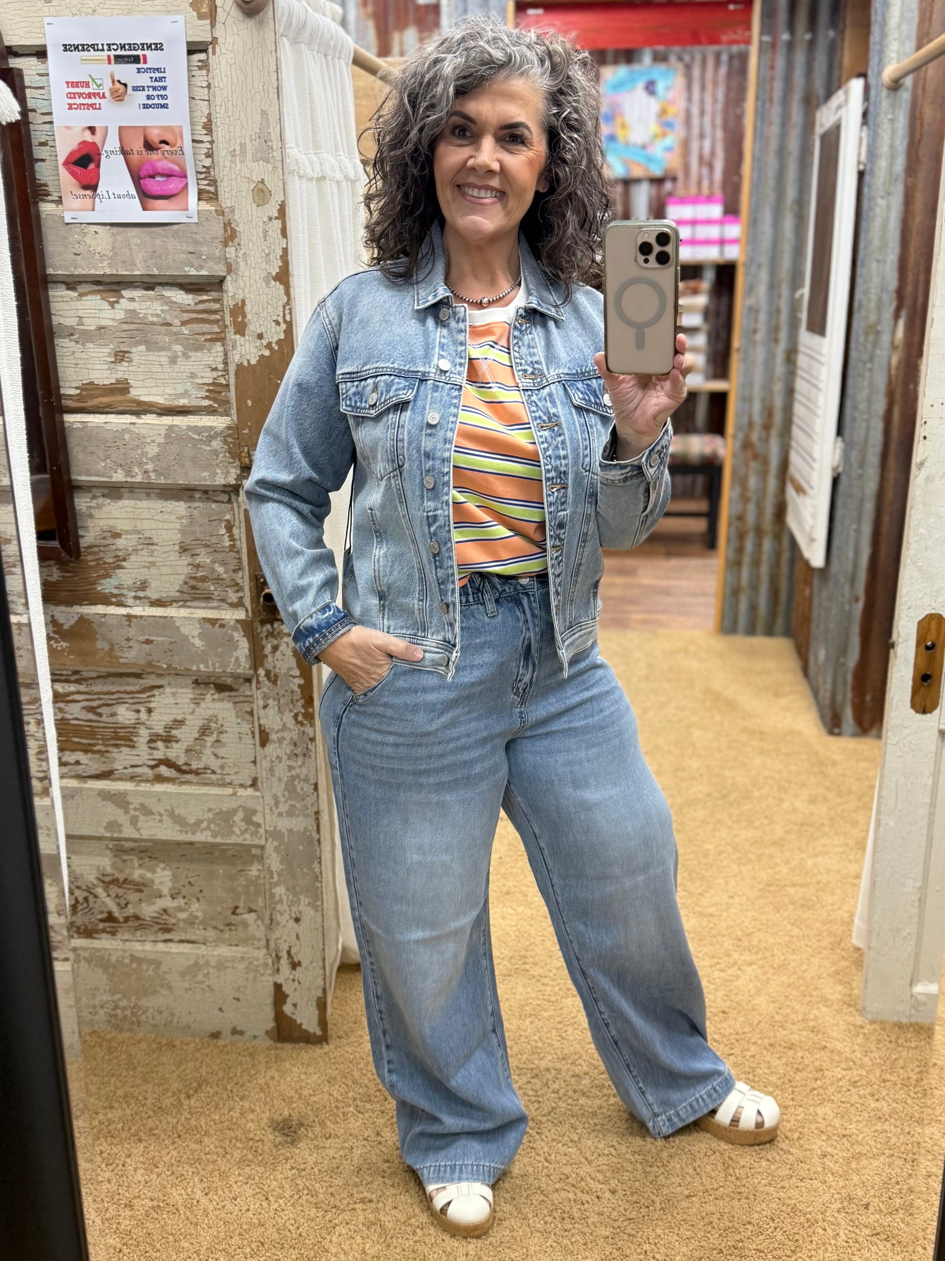 This striped short sleeve knit top features a relaxed, boxy silhouette designed for comfortable everyday wear. The classic crew neckline is finished with subtle stitch detailing for a casual, lived-in feel. The short sleeves offer a loose and easy fit, making this top effortless to style on its own or layered. Made from a soft and breathable knit fabric, this piece drapes naturally and works well for casual outings, lounging, or seasonal layering.