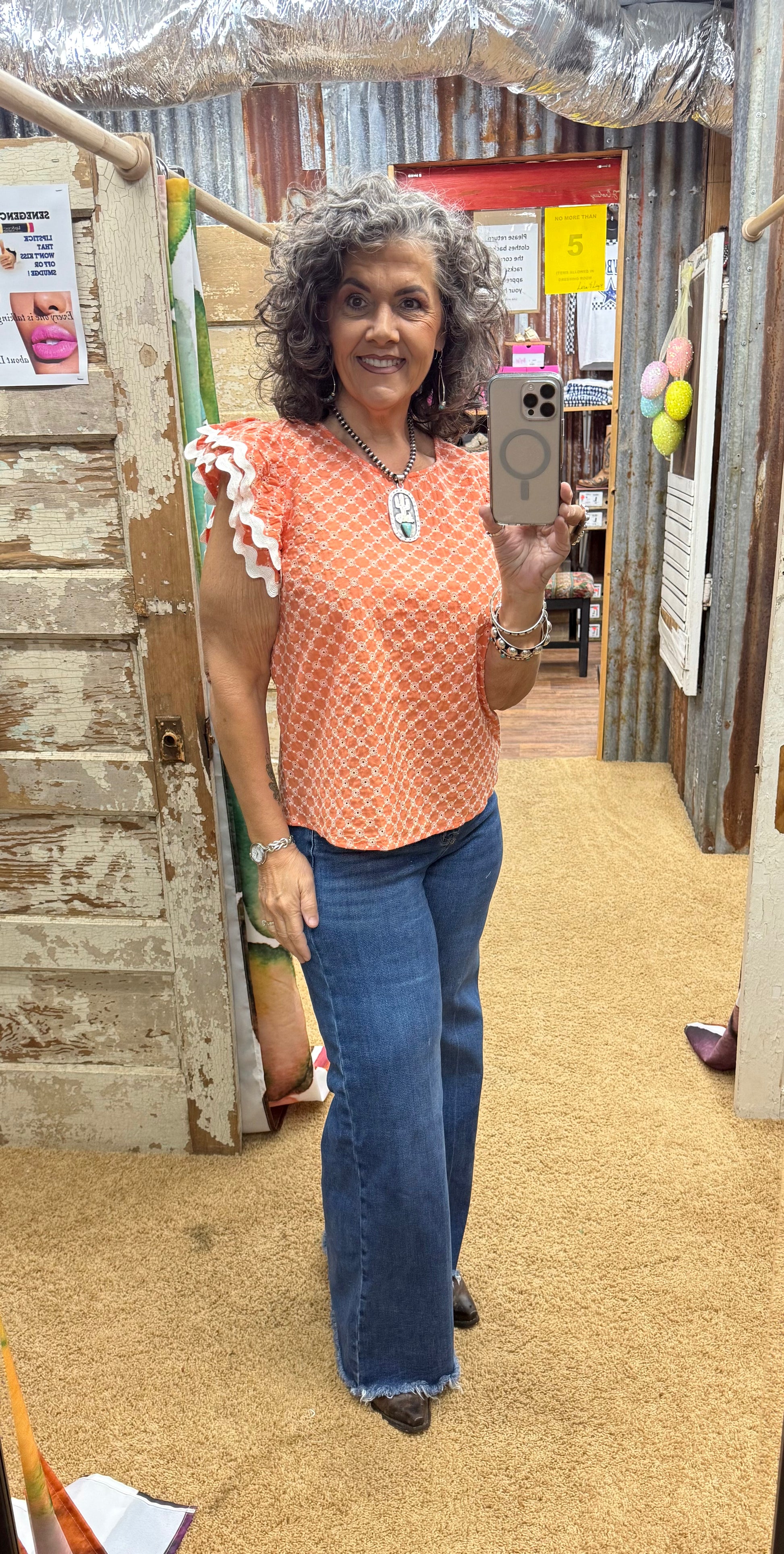 Add a touch of playfulness to your wardrobe with our Tangerine Eyelet Lace Top. Featuring ruffle sleeves with charming ric rac trim, this top will bring a fun twist to any outfit. The eyelet lace adds a touch of femininity, making it the perfect choice for any occasion. Step out in style with this unique top!