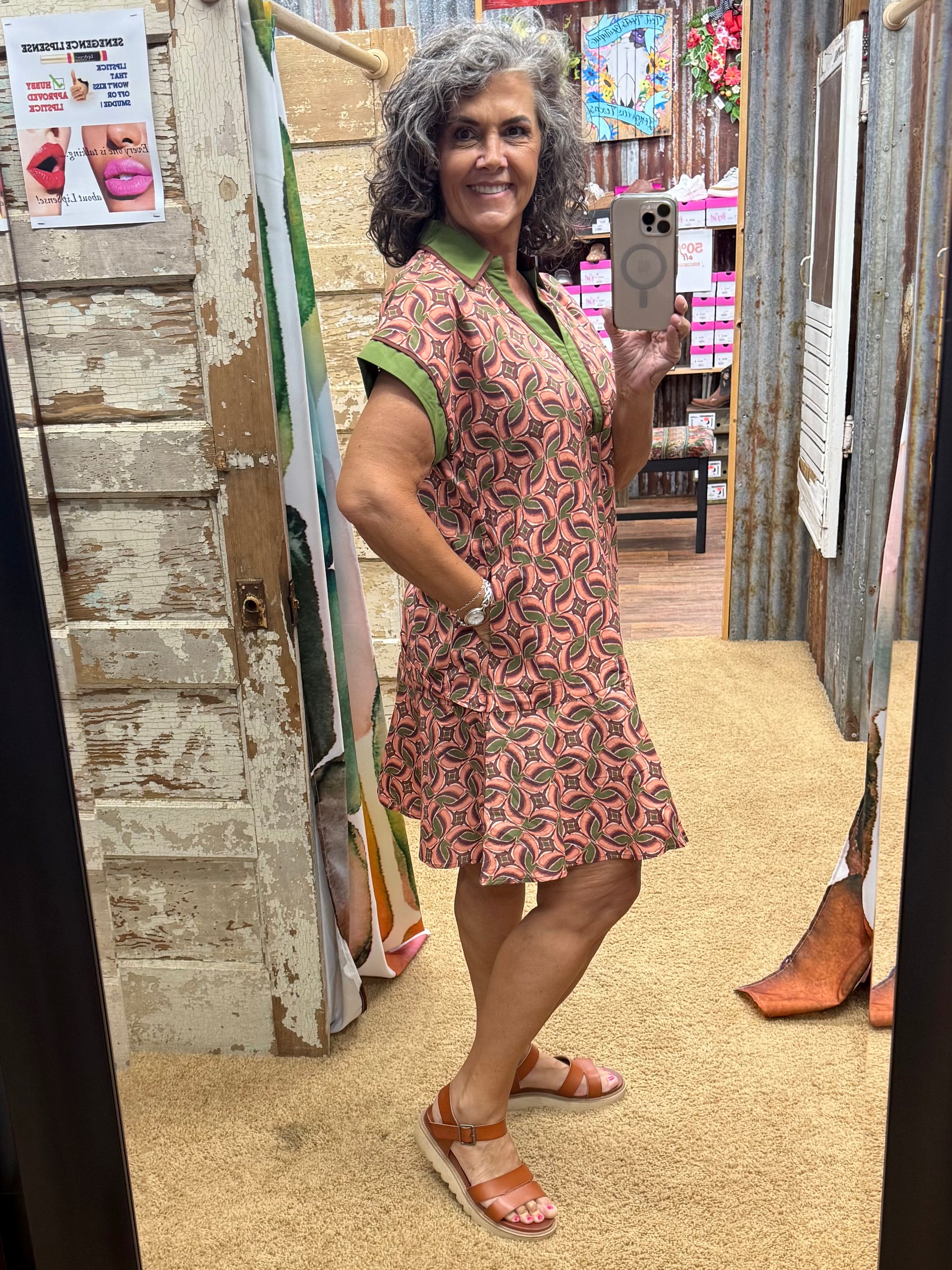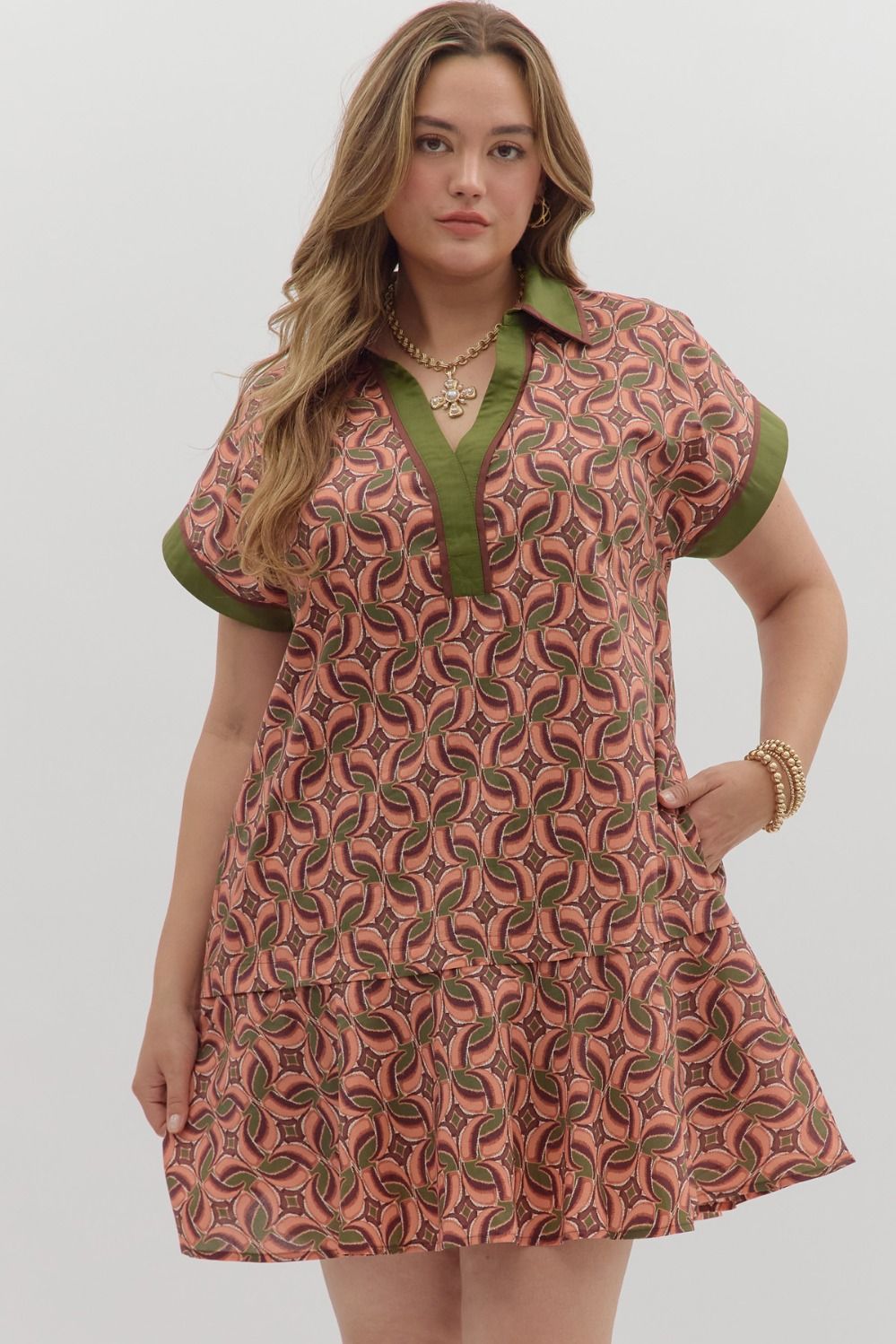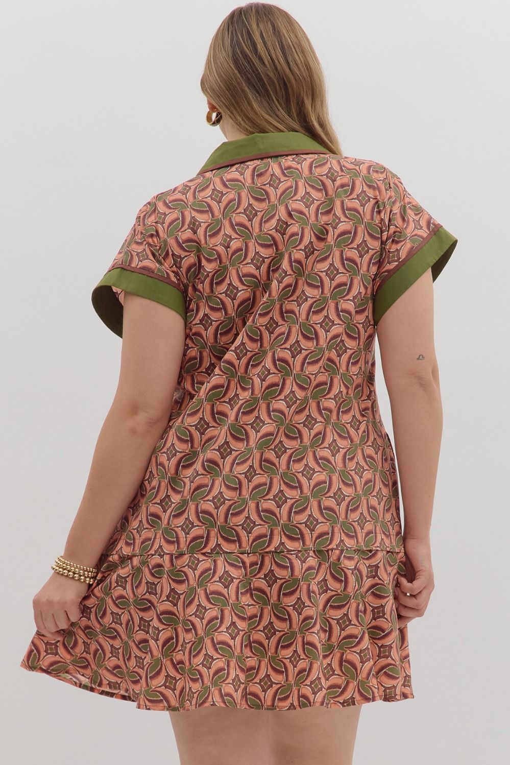 Turn heads in the Terra Cotta Dress by Entro, featuring a bold abstract pattern and a flounce ruffle hem that adds playful movement. The contrast accent spread collar sharpens your look, while side pockets offer practical flair. Lightweight and fully lined, this woven mini dress is non-sheer, perfect for making a daring statement with effortless style.