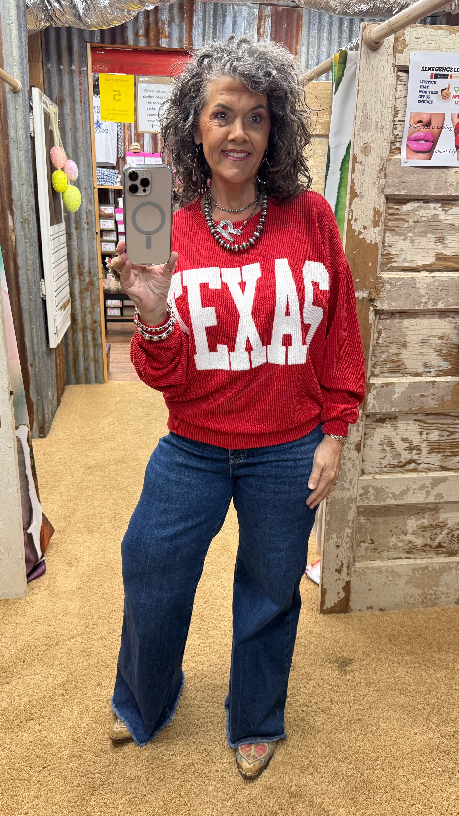 Unleash your inner Texan with our Texas Comfy Graphic Scarlet Red Sweatshirt. Made of corded fabric, this pullover sweatshirt features a crew neck and long drop-shoulder sleeves, perfect for casual wear. With its 95% polyester and 5% spandex fabric, you'll stay comfy and cozy all day long. Yeehaw!