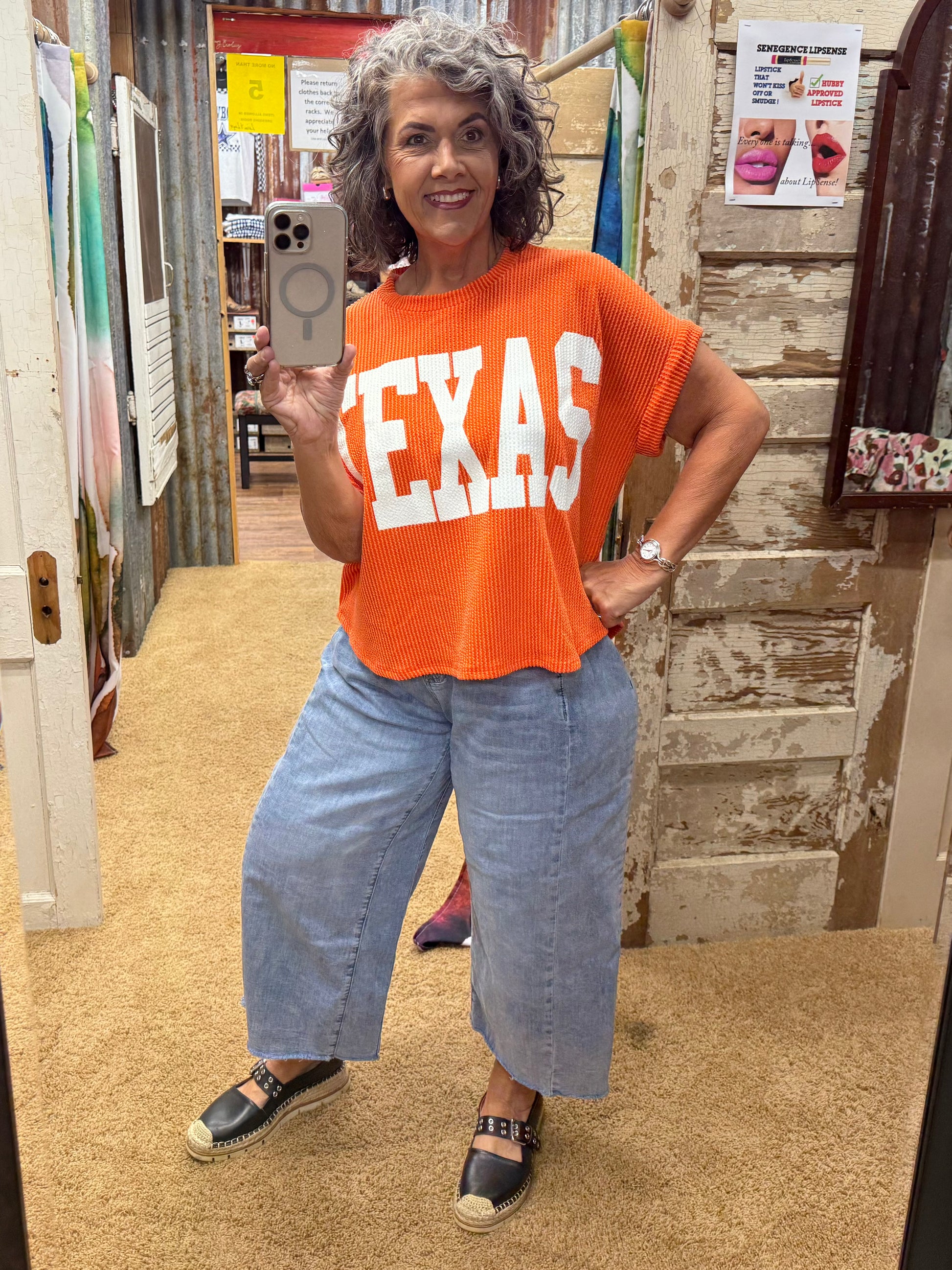 Unleash your inner Texan with this ribbed top in baby pink. The oversized "TEXAS" across the front adds a touch of urban flair to this short sleeve top. Perfect for showing off your fun and playful side.
