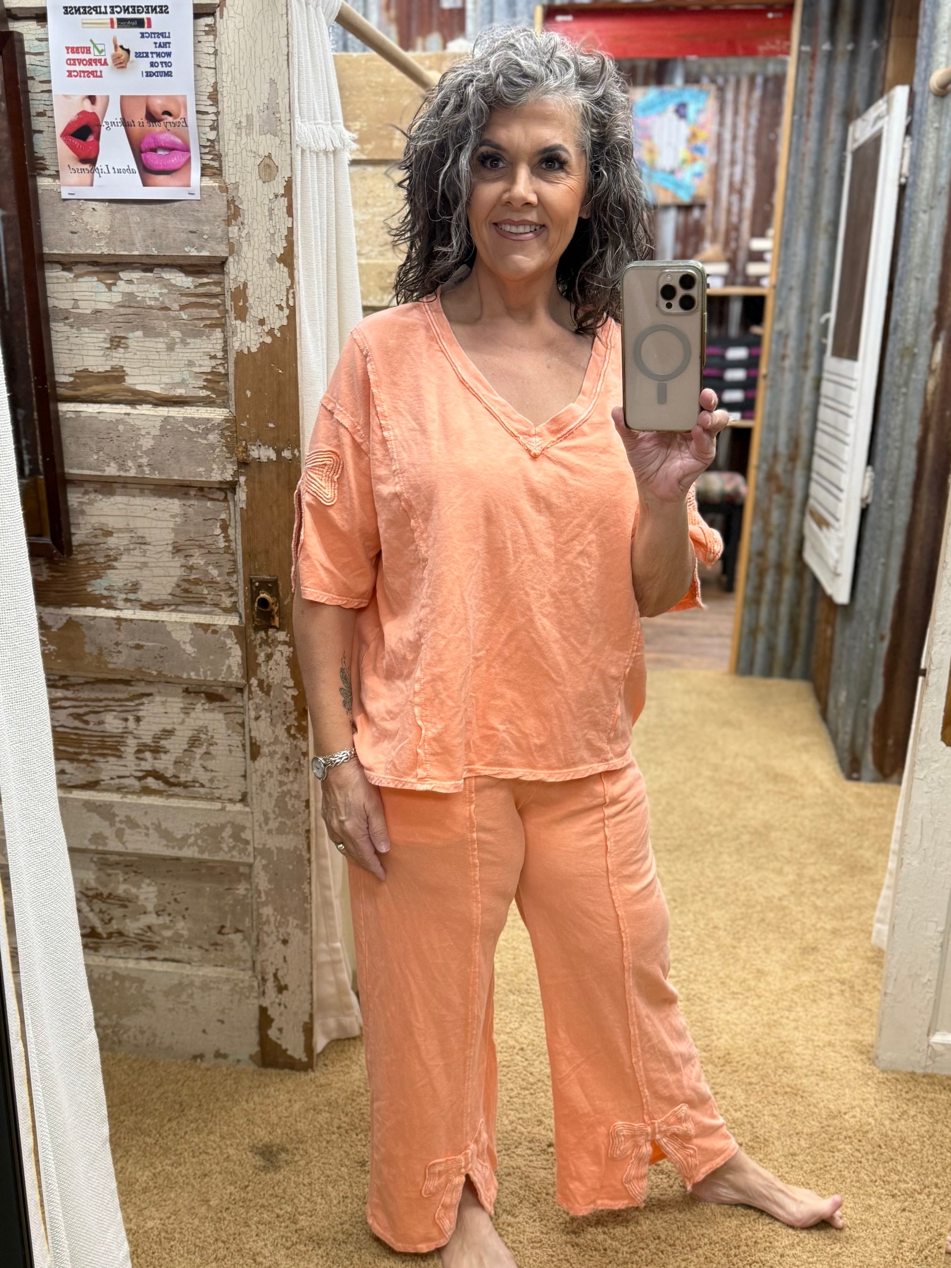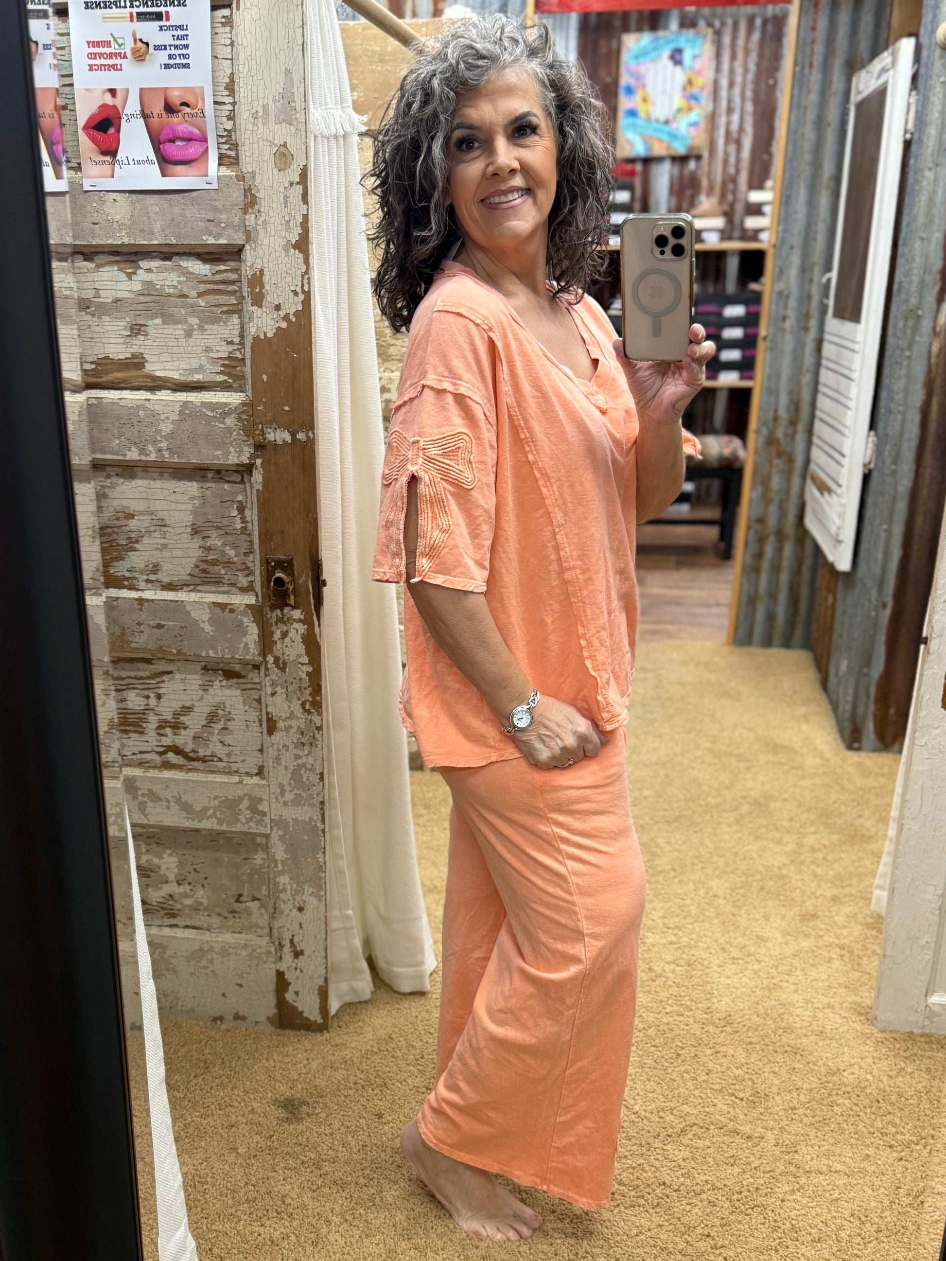 Adorable mineral-washed two-piece set featuring a slit blouse and matching slit pants, both trimmed with charming bow details. Perfect for a fun, flirty look that's effortlessly cute. Mix and match with your favorite pieces or wear together for coordinated style.