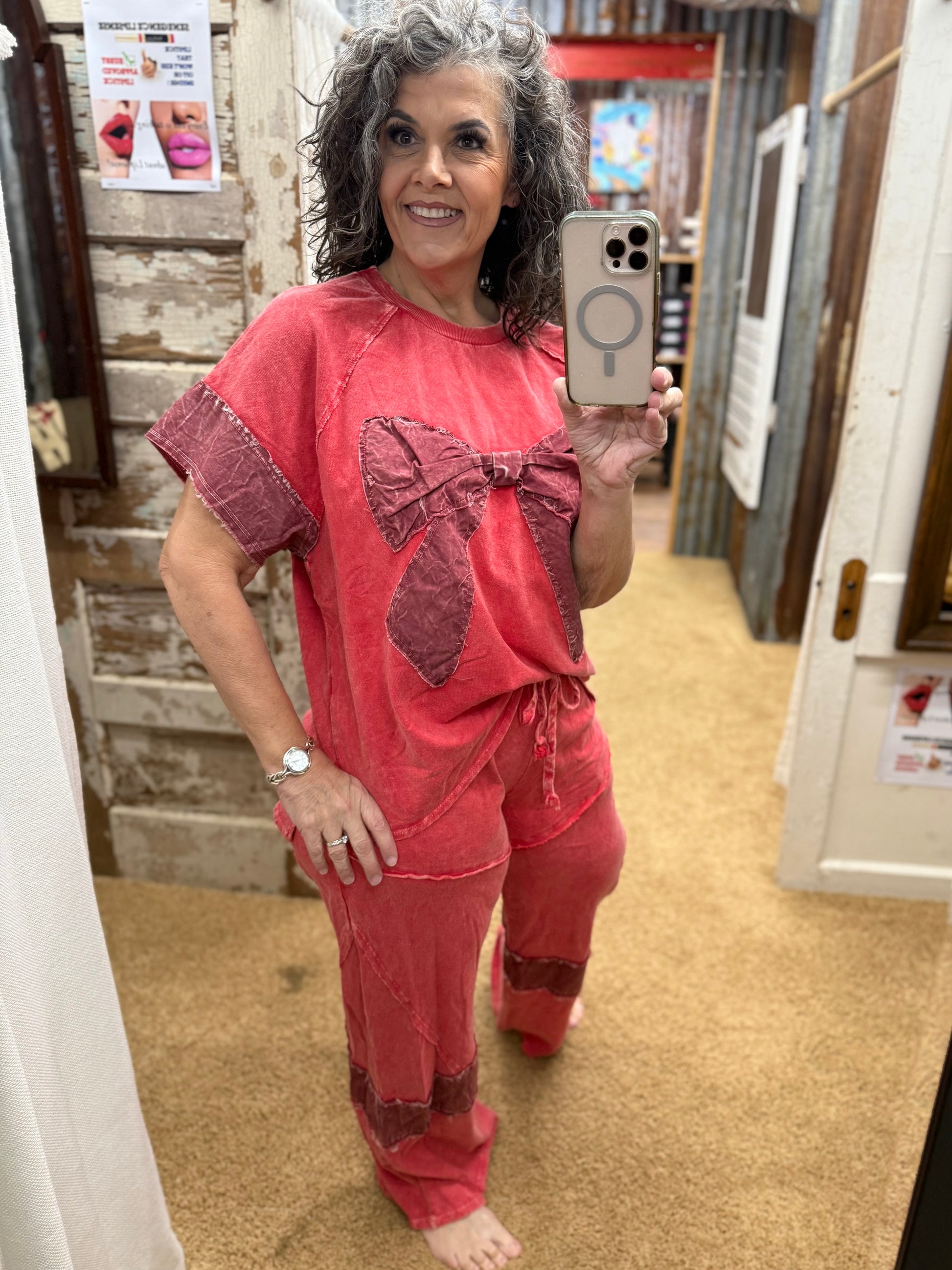 Elevate your loungewear game with The RED Lounge Set—a chic two-piece ensemble designed for effortless style. The mineral-washed wide-leg denim pants feature a classic denim patch detail that adds character and dimension, while the chambray denim ribbon bow top brings a touch of feminine sophistication. Perfect for relaxed days at home or casual outings, this set combines comfort with contemporary flair. Mix, match, or wear together for a polished look that transitions seamlessly from day to night.