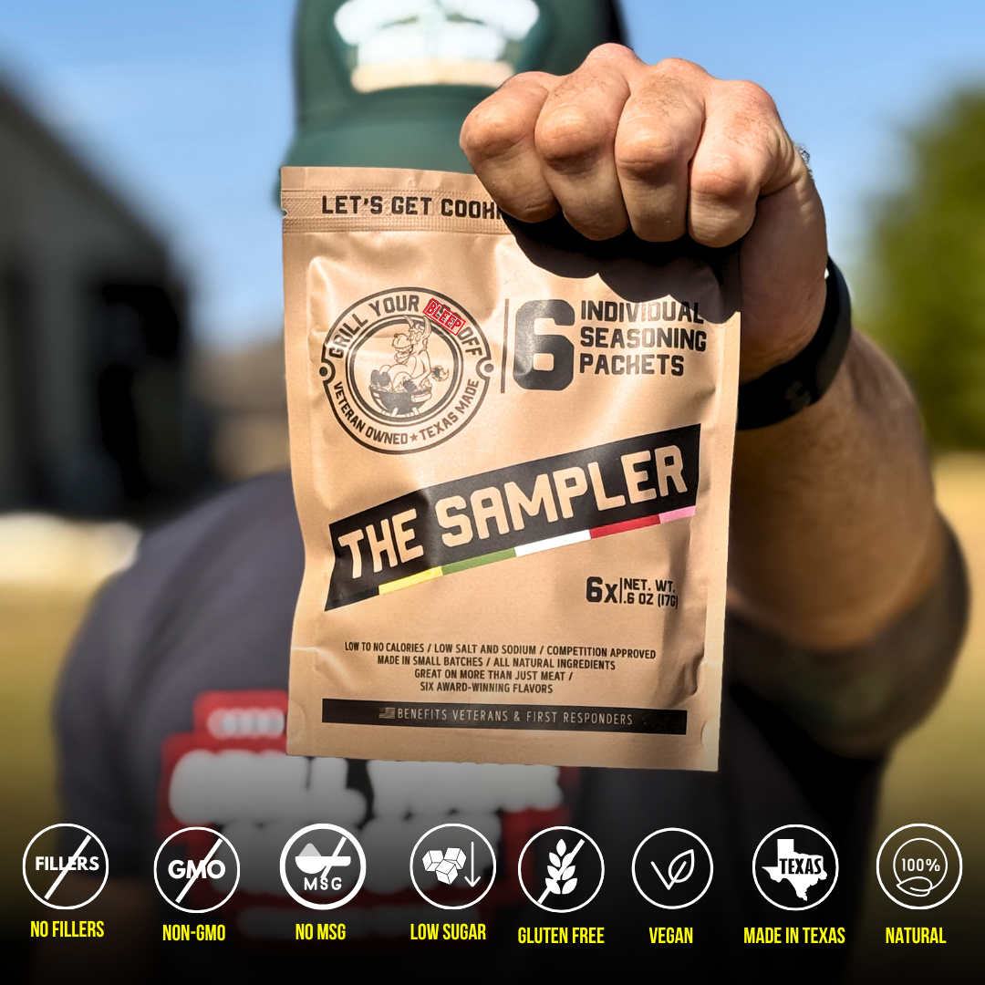 🎖️ The Sampler – Grill Your Ass Off’s MRE-Style Flavor Mission Lock and load your taste buds with The Sampler — the ultimate mission-ready collection of Grill Your Ass Off’s best-selling seasonings, packed in a rugged MRE-themed bag that’s equal parts fun, functional, and flavorful. Designed for food lovers, grill masters, and tactical snack warriors alike, this kit delivers a full arsenal of bold, veteran-crafted seasonings that bring serious heat and flavor to every meal. Each blend in The Sampler is handcrafted with premium ingredients — MSG-free, gluten-free, and made in Texas — to guarantee pure, clean flavor without compromise. From the sweet heat of Crispy’s Mango Habanero to the smoky perfection of Gunpowder Steak & Brisket, this set covers every craving on the culinary battlefield. Whether you’re grilling, smoking, or cooking indoors, it’s the perfect way to test the entire GYAO lineup before committing to your next favorite seasoning. 💥