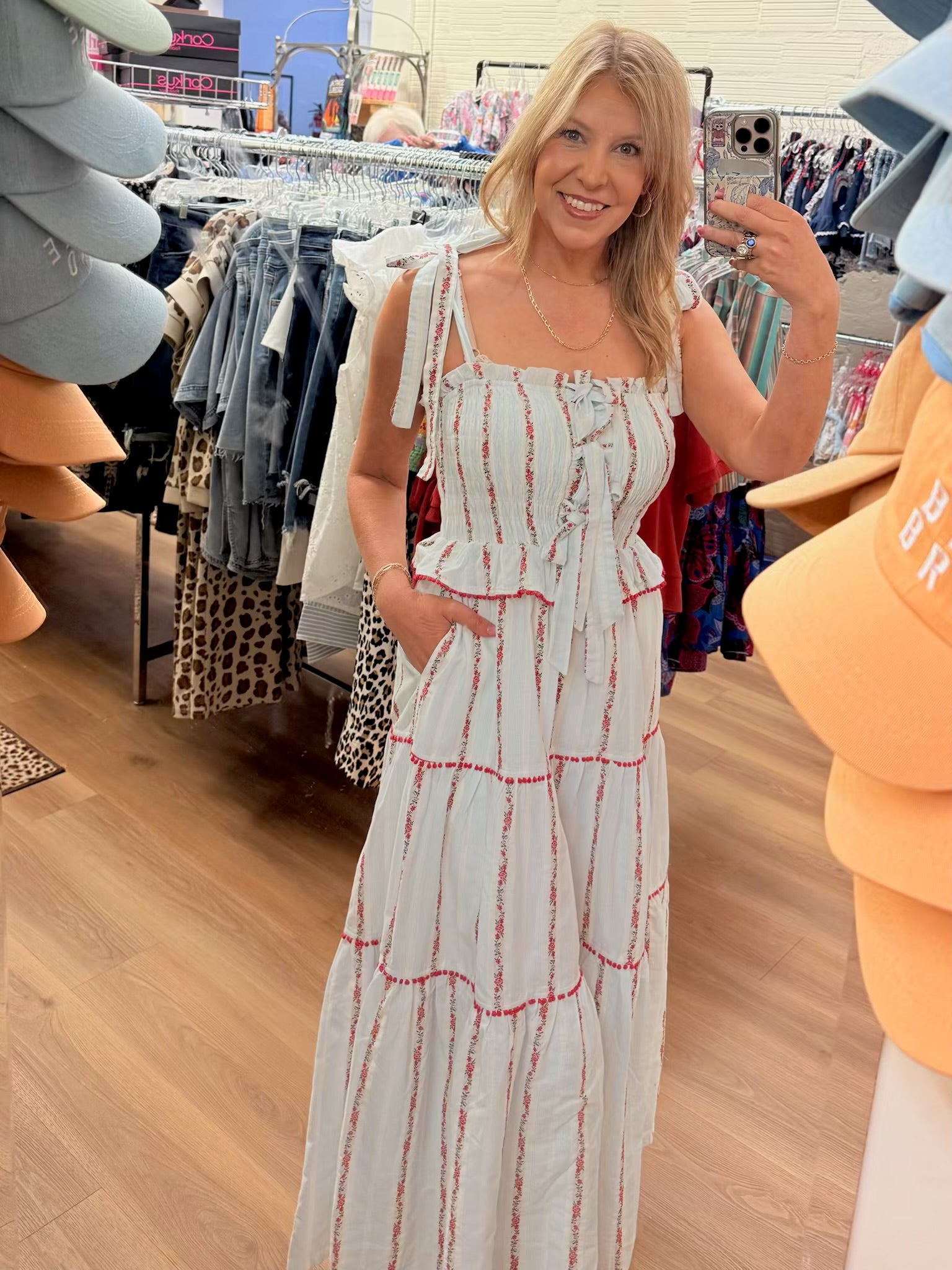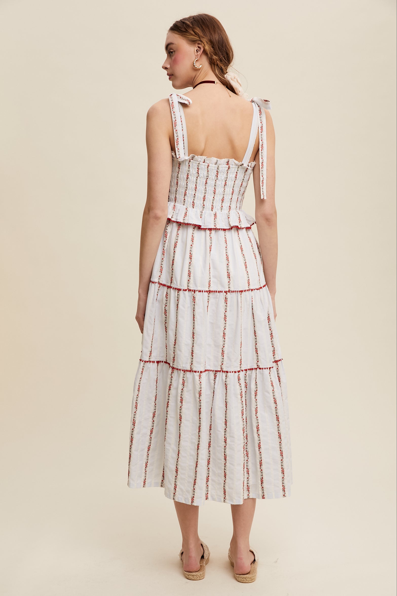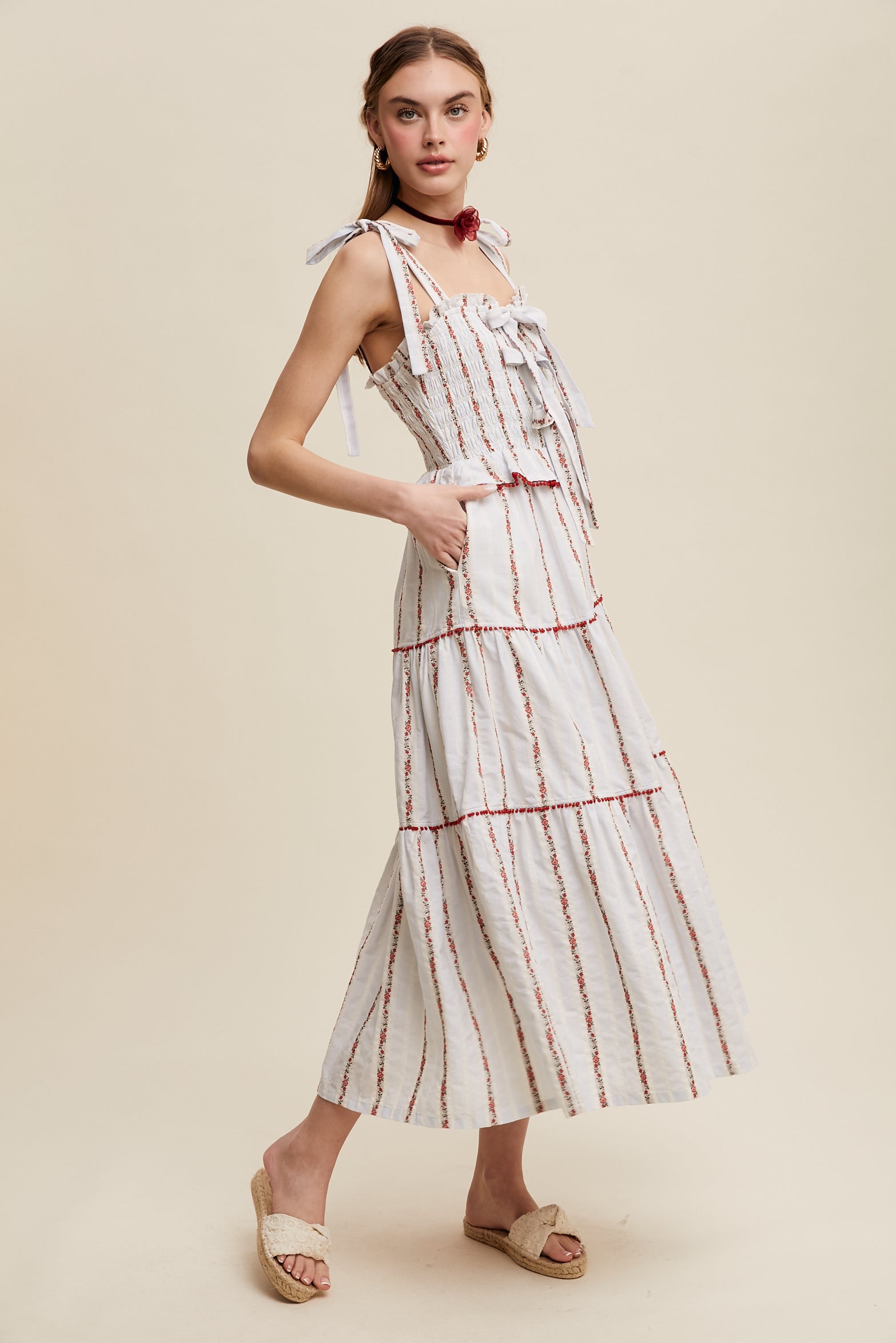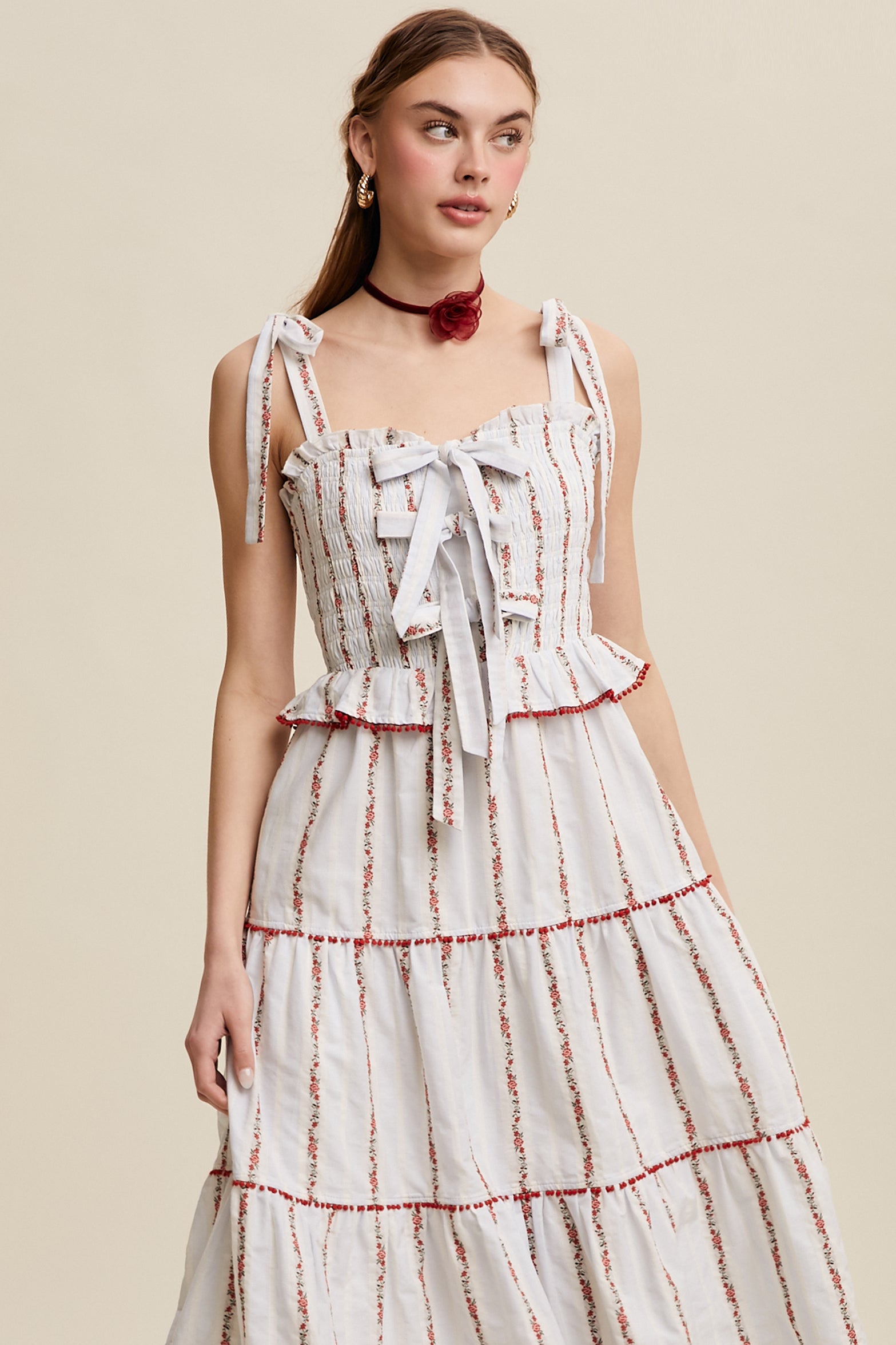 Twirl through summer in this charming Tiered Red Floral Embroidered Maxi Dress. The intricate floral embroidery and playful pom-pom trim add sophistication and movement. Adjustable bow tie straps and a smocked bodice ensure a flattering fit, while functional pockets add practicality. Fully lined and lightweight, it's perfect for garden parties.