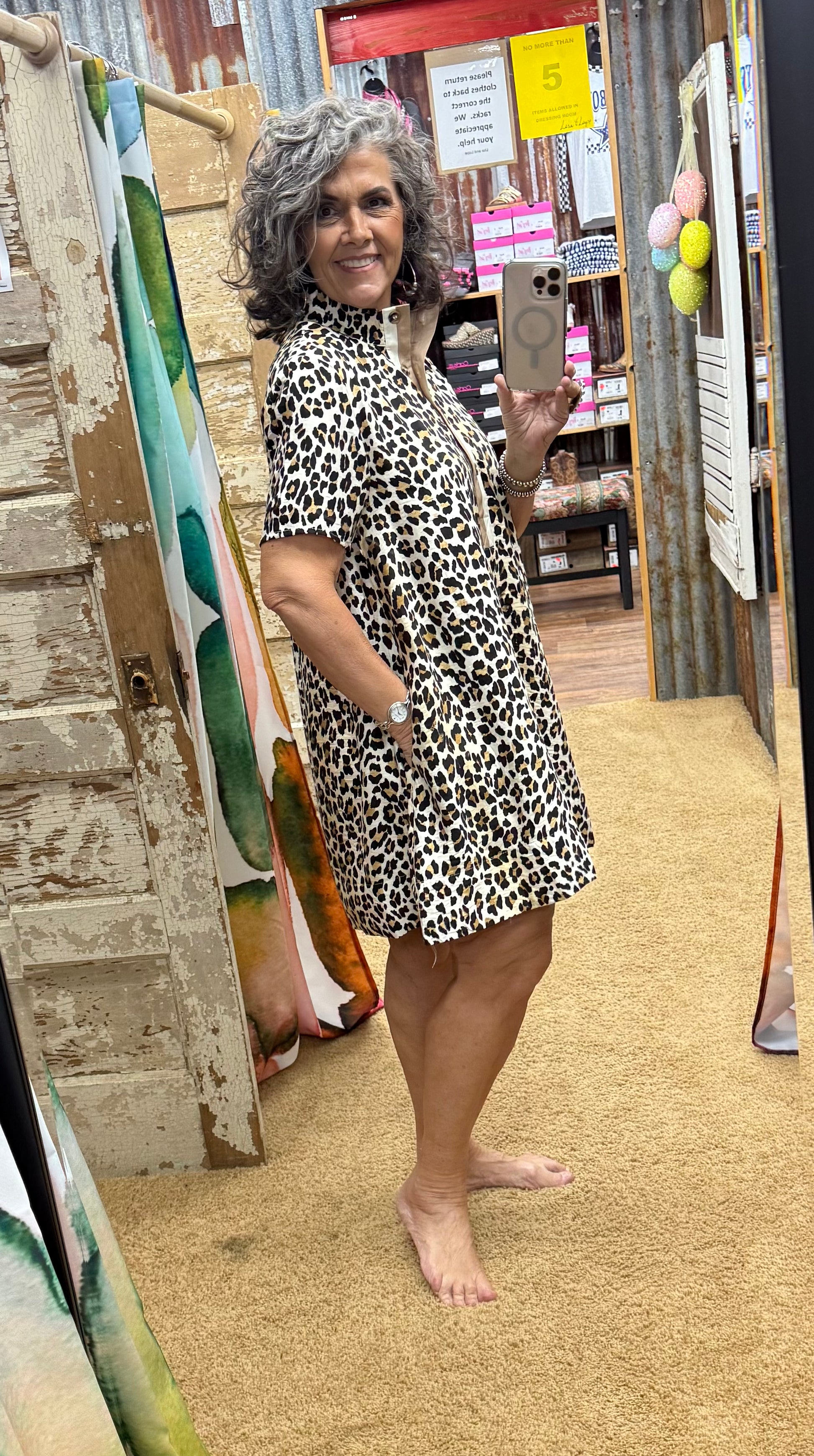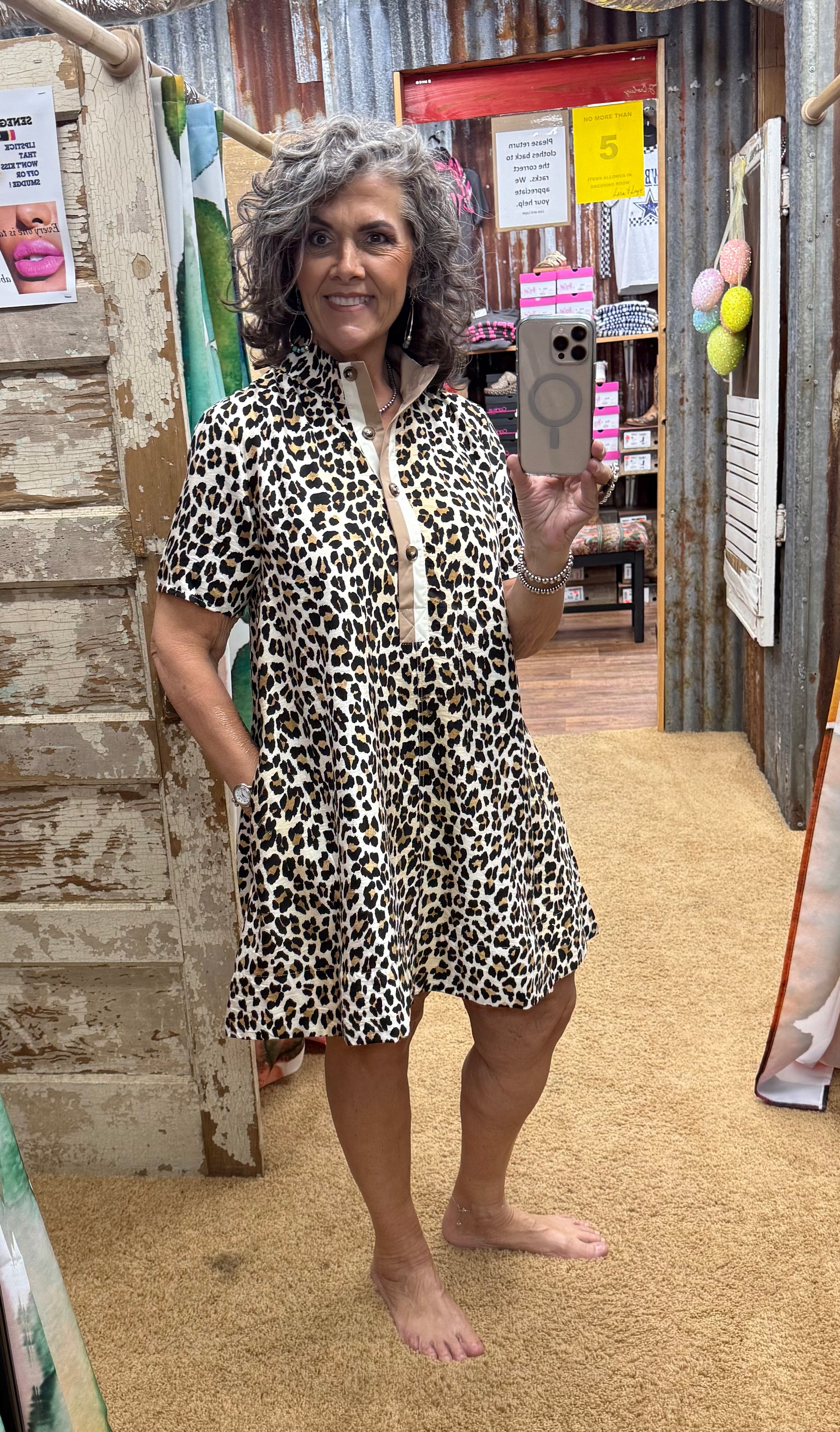Unleash your wild side with this Touch of Safari Dress! Embrace your inner feline with a leopard print design and stay stylish with a multicolor high band collar. The front half button closure adds a touch of elegance while the pockets at the sides provide functionality. Perfect for a playful and quirky look!