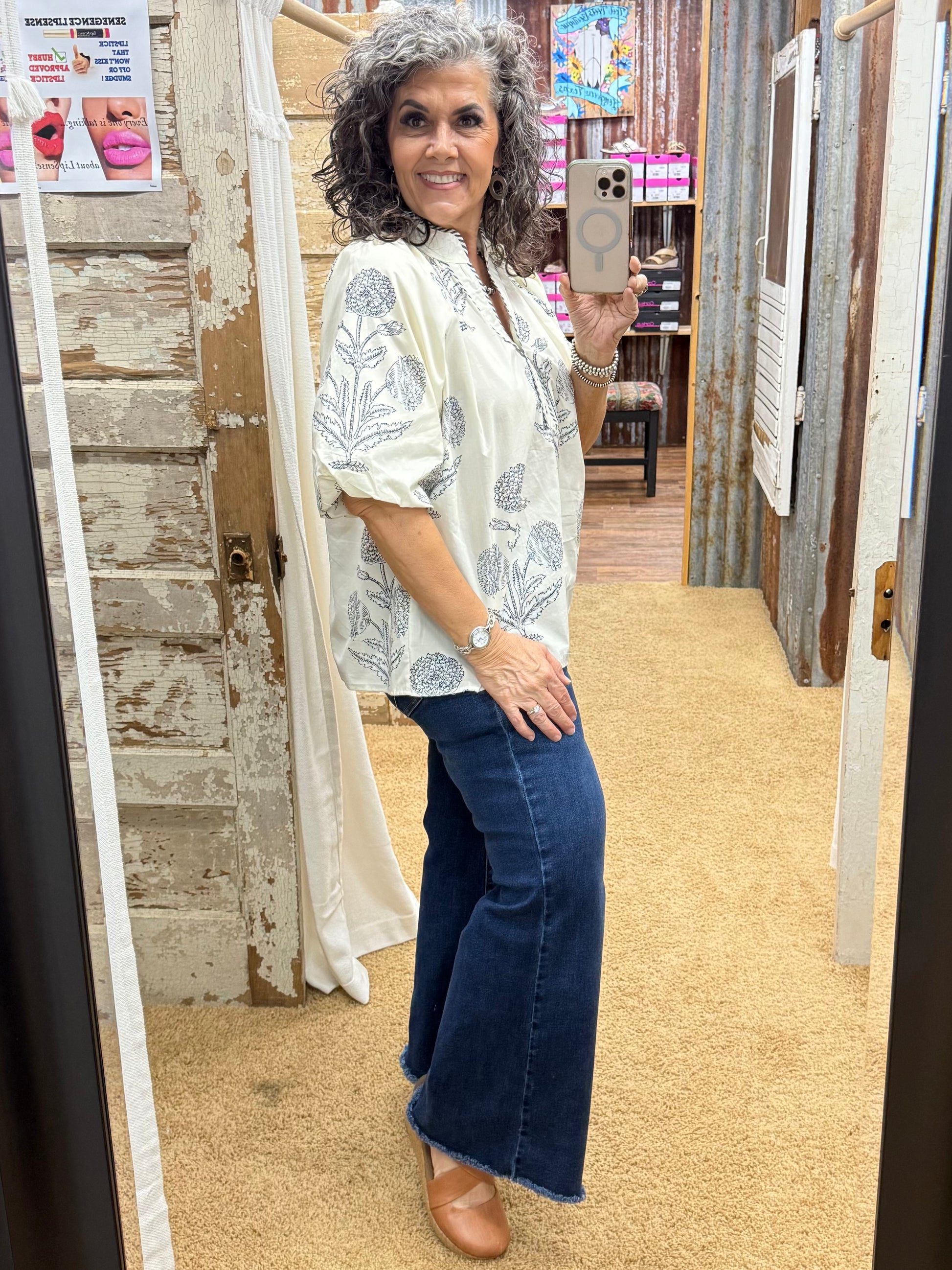 UMGEE Ecru/Black Floral Print V-Neck Top