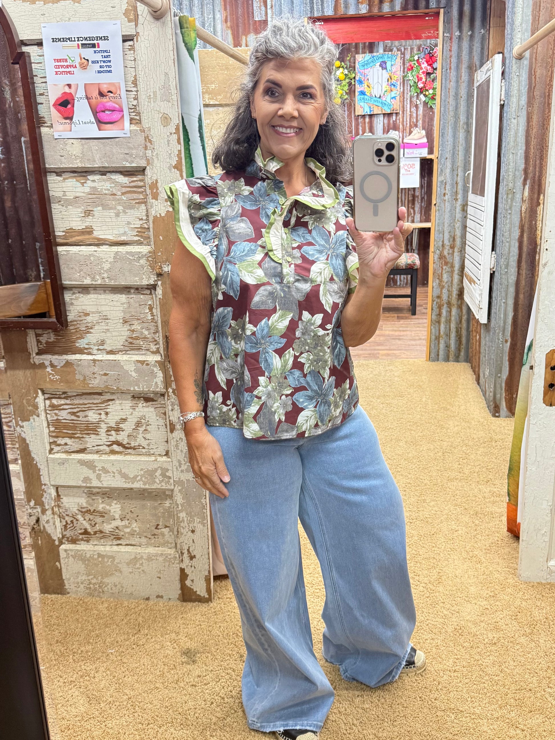 This playful blouse features a vibrant floral print with multicolor contrast accents and charming ruffle details along flutter sleeves and the band collar. Crafted from lightweight, breathable 100% cotton, it offers a comfortable, non-sheer fit with a front button closure for easy wear. Perfect for adding a fun, feminine touch to any outfit.
