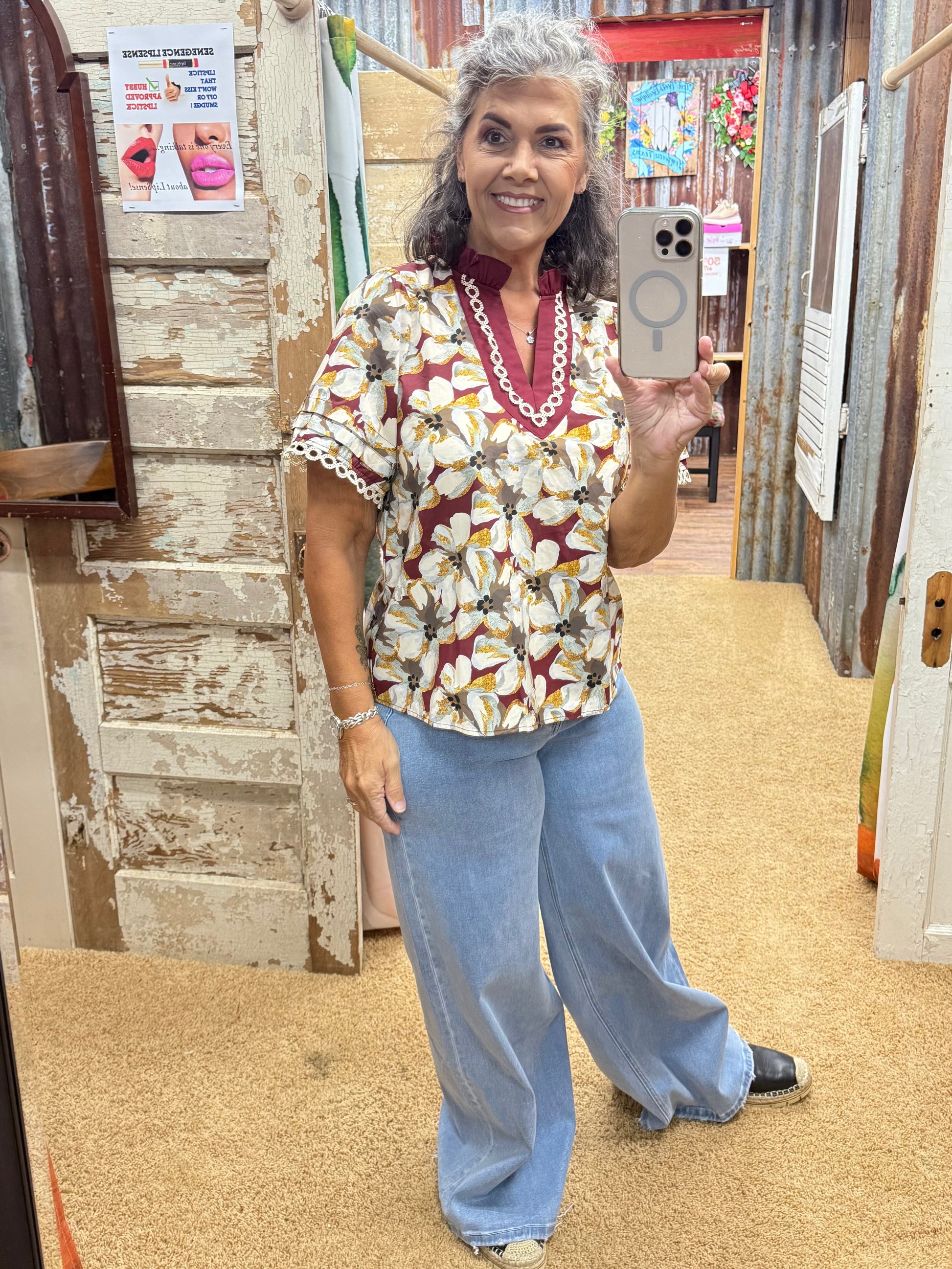 This playful Wine Floral Print Entro Blouse brings a fresh twist to your wardrobe with its charming floral print and delicate pleated short sleeves. The contrast ruffle V-neck adds a flirty touch, while the lightweight, 100% cotton woven fabric keeps you cool and comfortable all day long. Unlined and non-sheer, it’s perfect for effortless style with a breezy feel.