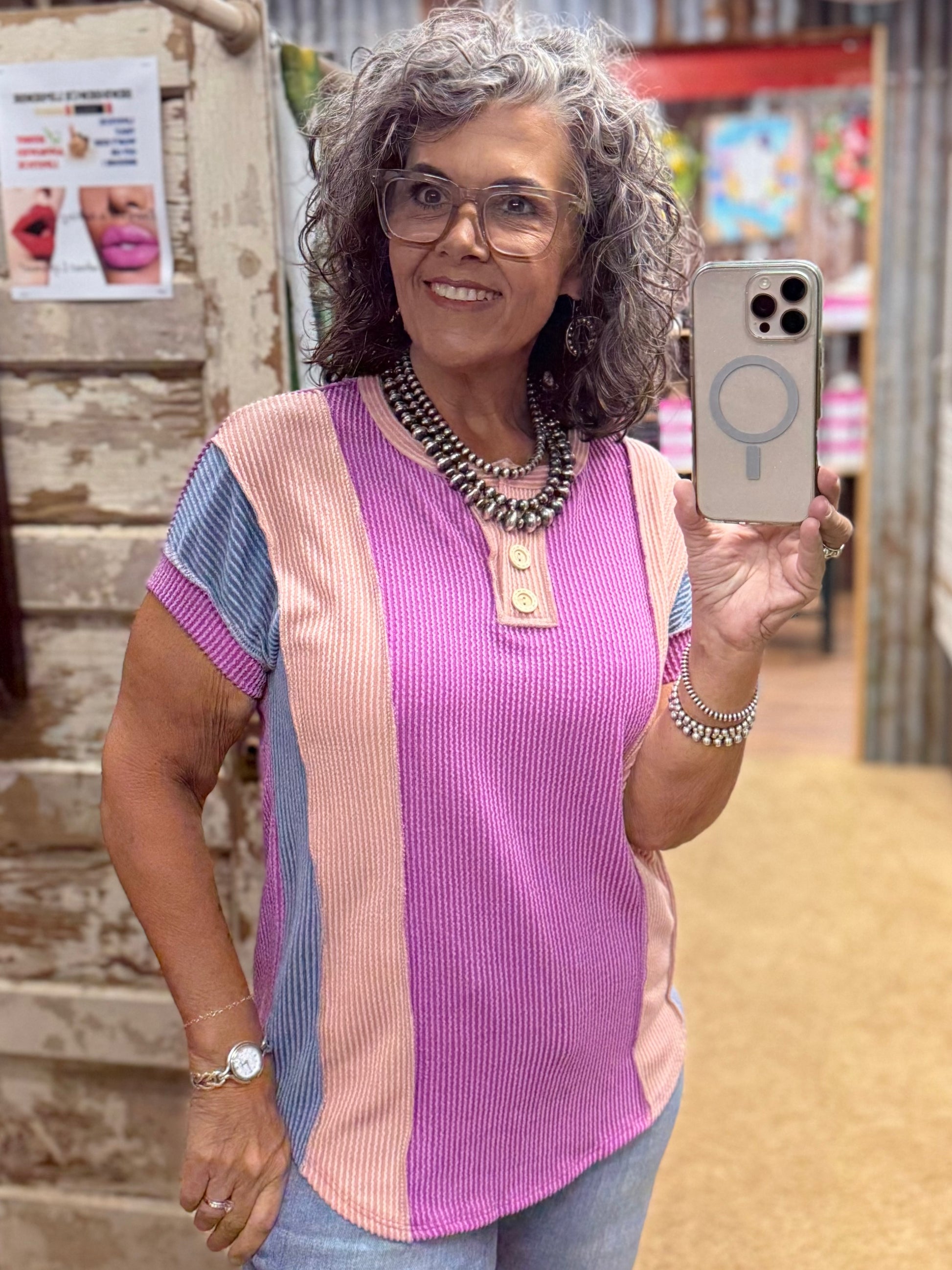 This Magenta Twist Rib Color Block Knit Top brings fun to your wardrobe with its playful patchwork design and vibrant color blocks. Featuring a twist rib texture, button-front detail, and exposed stitching, it adds a quirky touch to your look. The round neck and short sleeves keep it comfy and perfect for layering or wearing solo on sunny days.