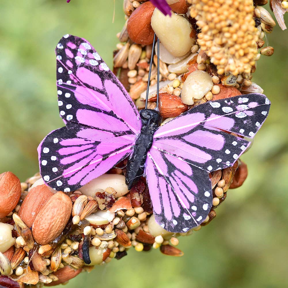Grapevine wreath coated in premium birdseed, peanuts, and tree nuts. Features a fresh millet spray treat. Decorated with a darling butterfly and lavender raffia. Excellent for spring and summer sales.