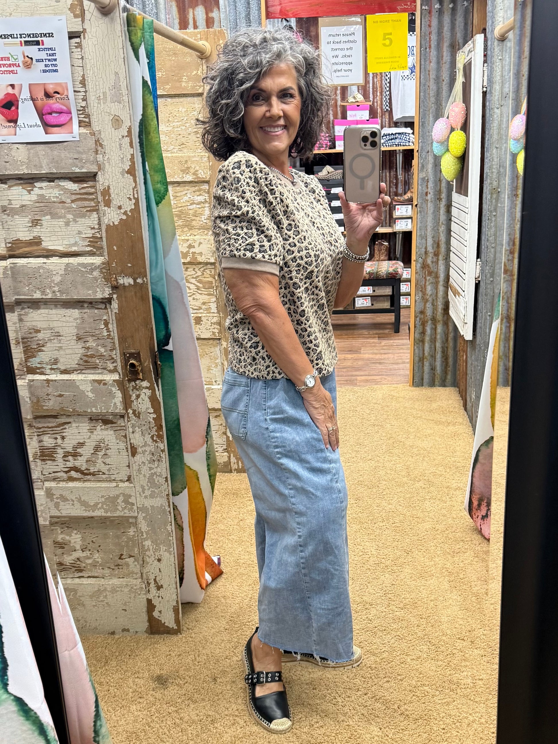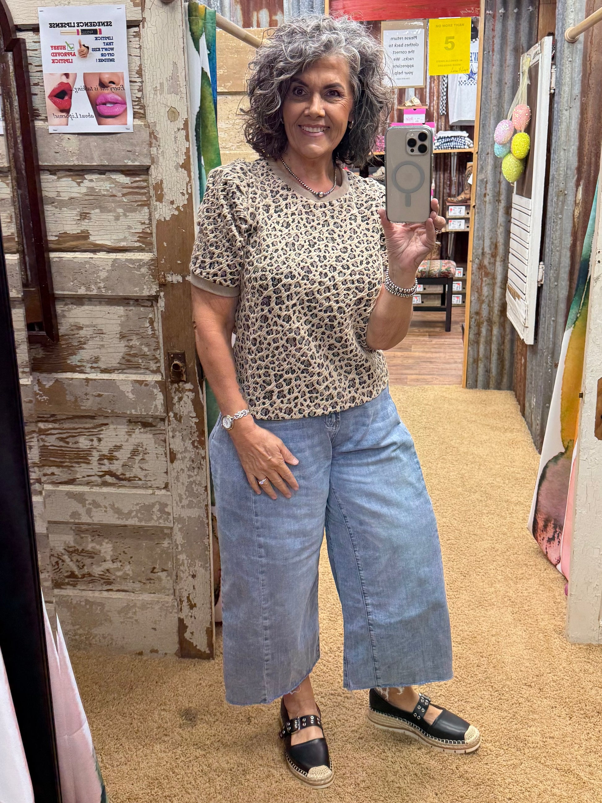 Get wild and stylish with the You make me WILD Blouse. This playful leopard pattern top features structured shoulders and pleated short sleeves for a unique and fashionable look. The lightweight, non-sheer knit makes it perfect for any occasion. Unleash your wild side today!